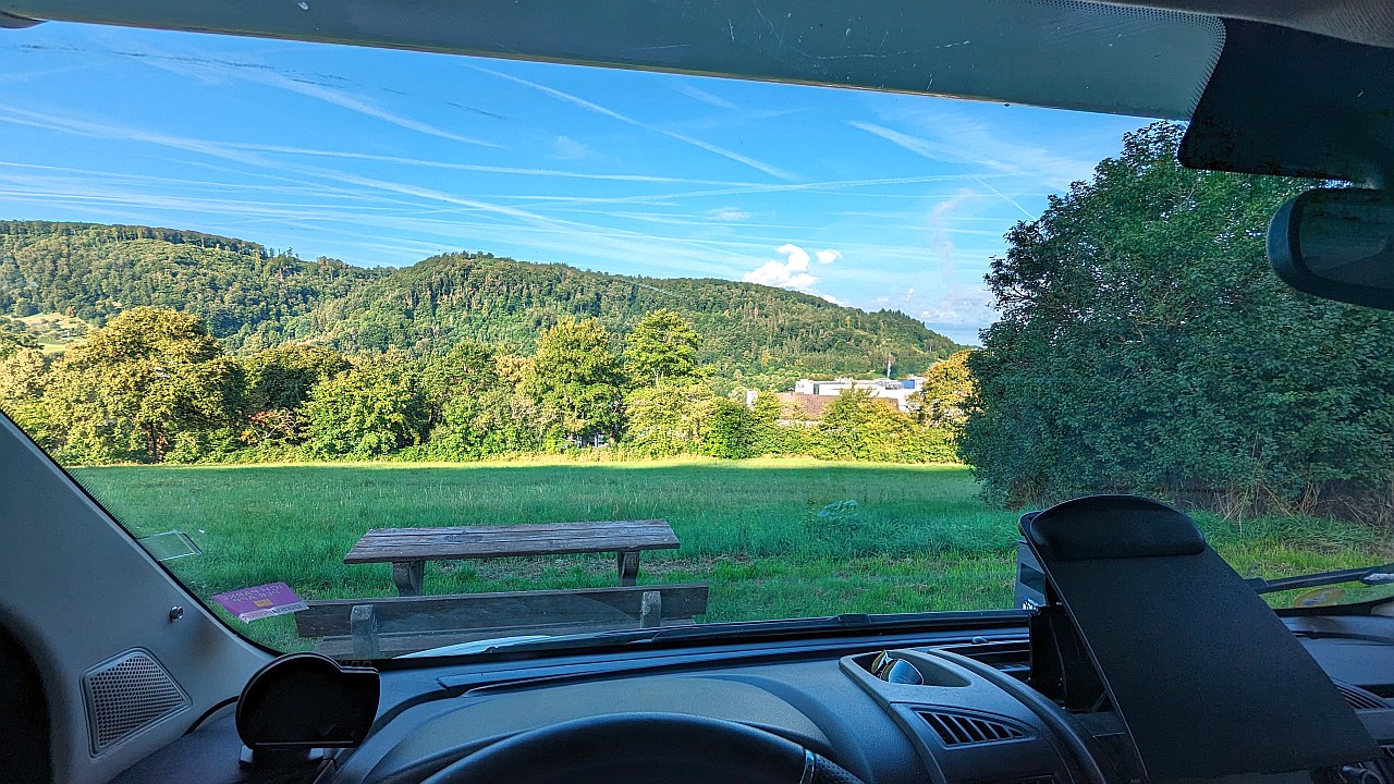Um 1 Uhr bat Xenia, dass Udo das Auto auf einen anderen Parkplatz fährt, wo wir schlafen können. Er ließ sich überreden, wobei sich die Parkplatzsuche zuerst schwieriger gestaltete als gedacht. In der Dunkelheit ist Udo nach der Aufforderung des Navis falsch abgebogen und in einem kleinen Weg regelrecht steckengeblieben. Es blieb nichts anderes übrig, als rückwärts wieder rauszufahren – ein schwieriges Unterfangen mit dem großen Auto in der Nacht. Aber schließlich war es geschafft und wenige Minuten später erreichten wir den ausgesuchten Wanderparkplatz oberhalb von Unterkochen am Waldrand. Dieser Platz war dafür ein Glücksgriff, wie wir am nächsten Morgen sahen. Ruhig, außer ein paar Joggern und Leuten mit Hund niemand unterwegs, mit schöner Aussicht und einem Bänkle vor dem Auto.