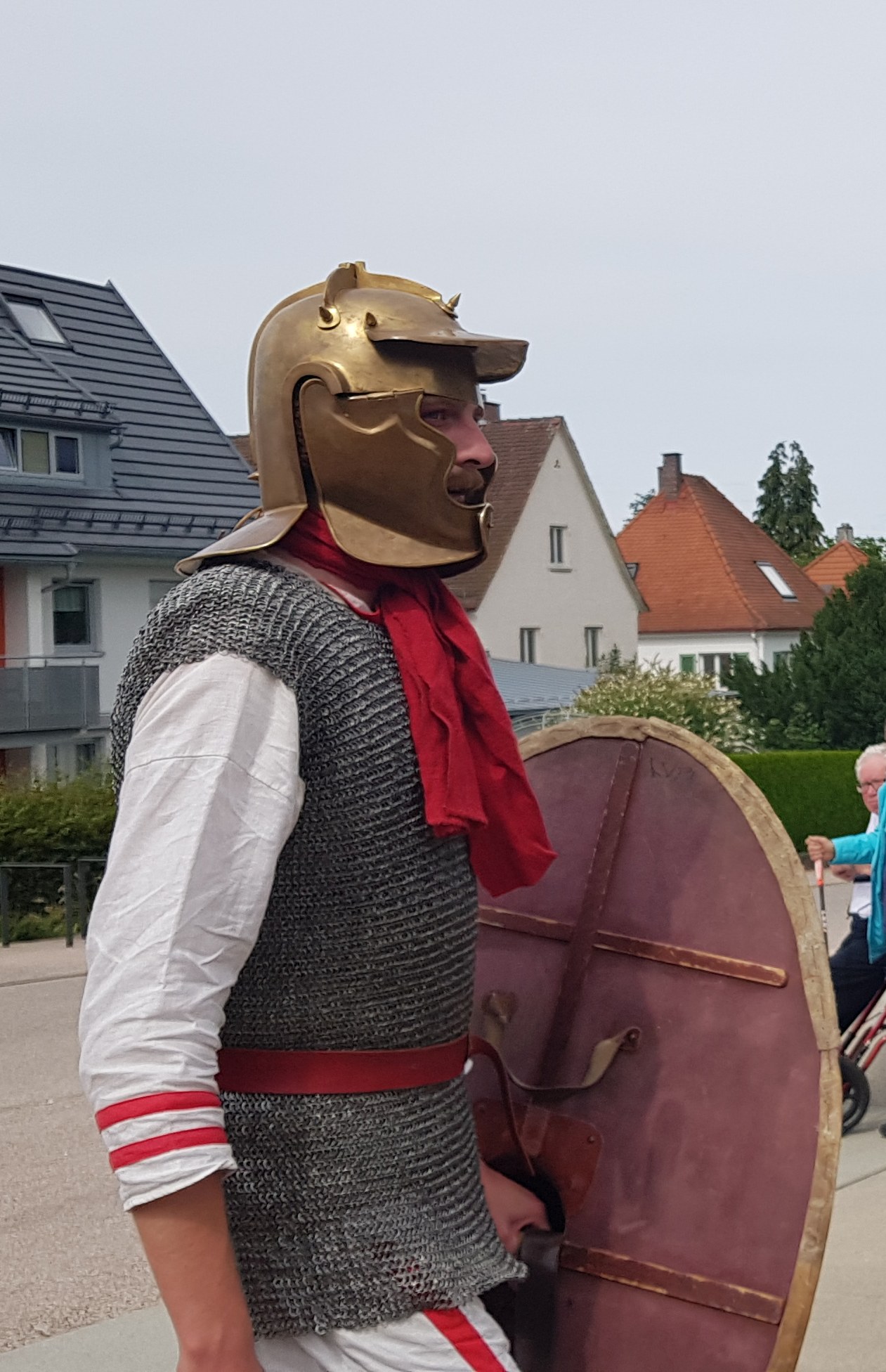 In Aalen gönnten wir uns in einem Café Kuchen, Cappuccino und Eisschokolade, Udo dann im Anschluss noch einen Yufka bei einem Türken. Wir beschlossen, noch am Limesmuseum vorbeizuschauen und auszukundschaften, ob man dort Fahrräder laden kann und wie es mit Parkmöglichkeiten für die Berta aussieht. Wir kamen am Museum an, kurz bevor ein paar Minuten später ein „Römer auf Wanderschaft“ ankam. Einige Familien und insbesondere eine ganze Anzahl Kinder hatten ihn schon sehnsüchtig erwartet. Seine Kameraden waren wohl noch verhindert und auf diese haben wir auch nicht mehr gewartet. Angekündigt wurde die Aktion so: „Am 08. August werden fünf Soldaten in kompletter Kampf- und Marschausrüstung vom Römerkastell Eining entlang des Limes bis zur Römerwelt Rheinbrohl marschieren. Dabei schlagen sie ihr Marschlager im Archäologischen Park des Limesmuseums auf.“