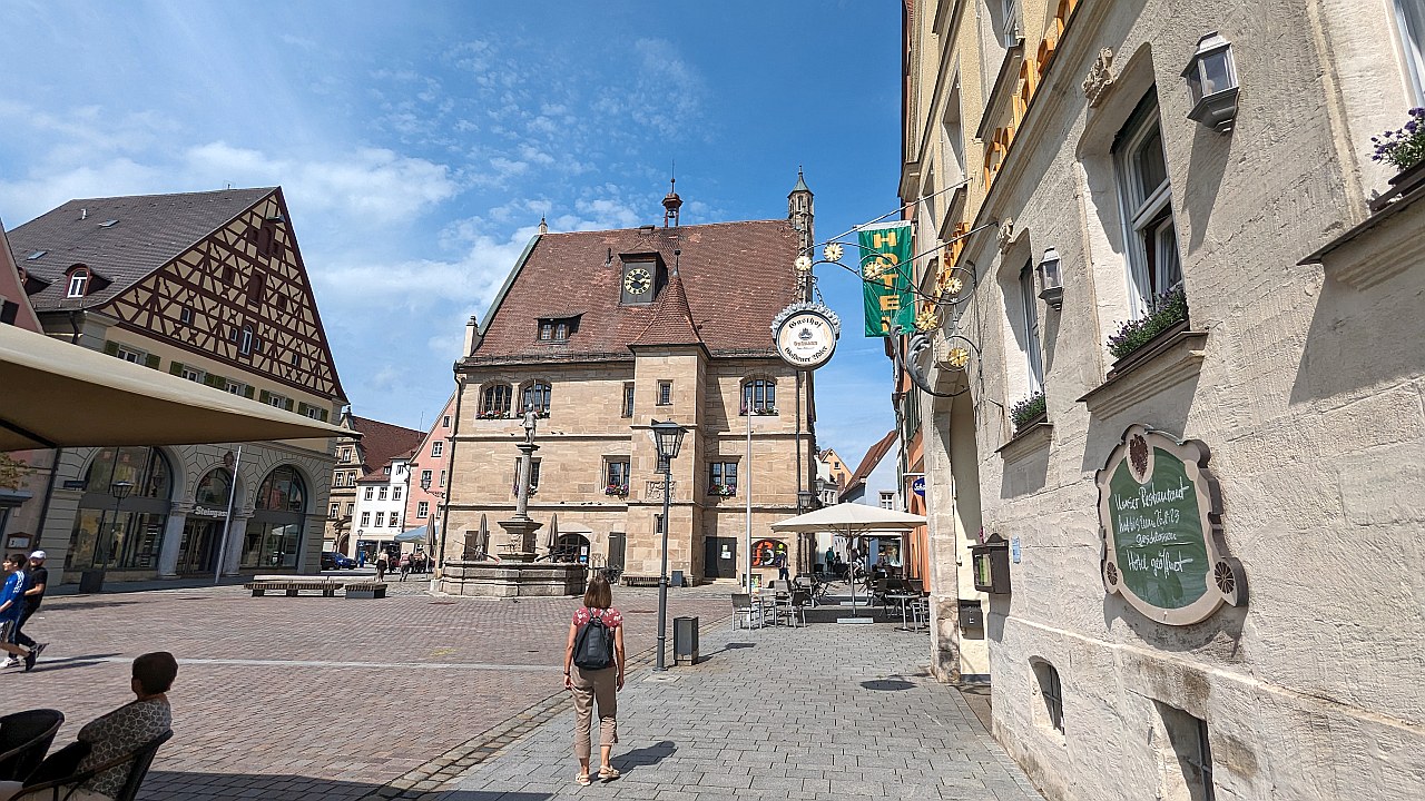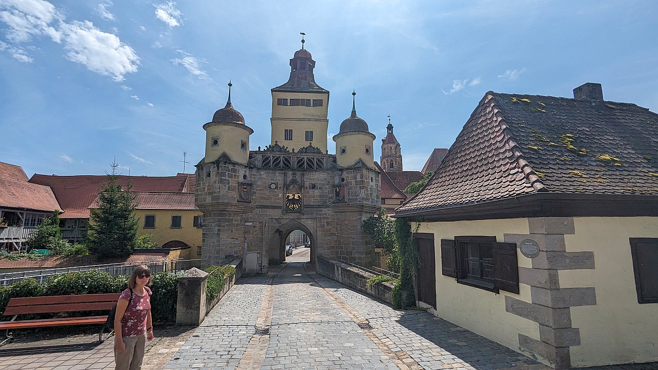 Um 12:30 Uhr waren wir wieder an der Berta und fuhren eine kurze Strecke nach Solnhofen, zu einem Lidl-Parkplatz ganz in der Nähe der Altstadt. Nach einer Mittagspause machten wir uns bei Sonnenschein auf den Weg, spazierten durchs Ellinger Tor, drehten eine Runde durch die Altstadt und besuchten das Römermuseum.
