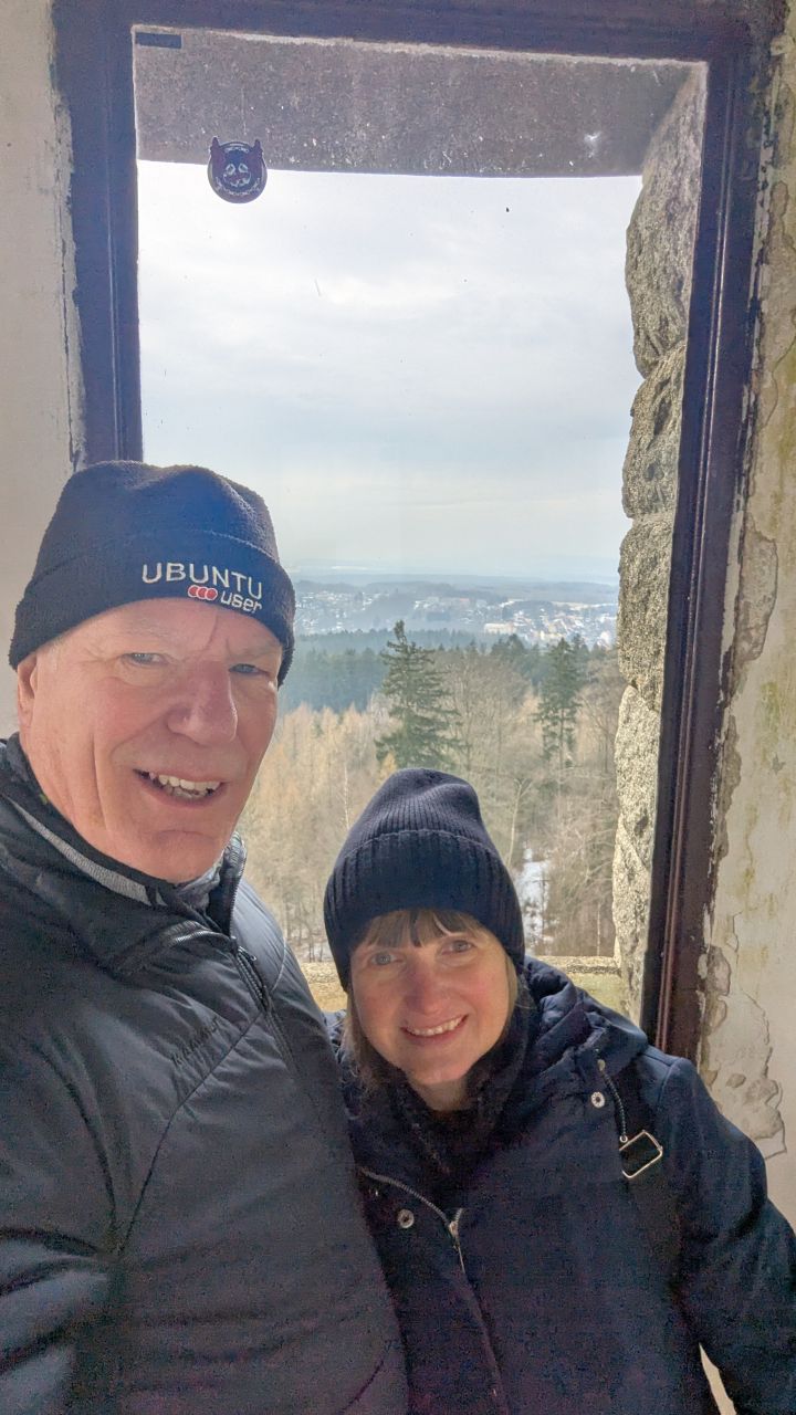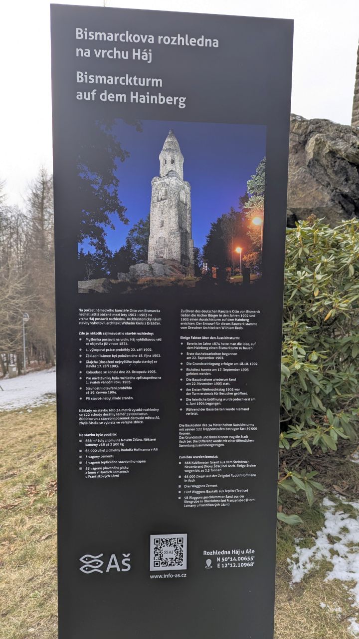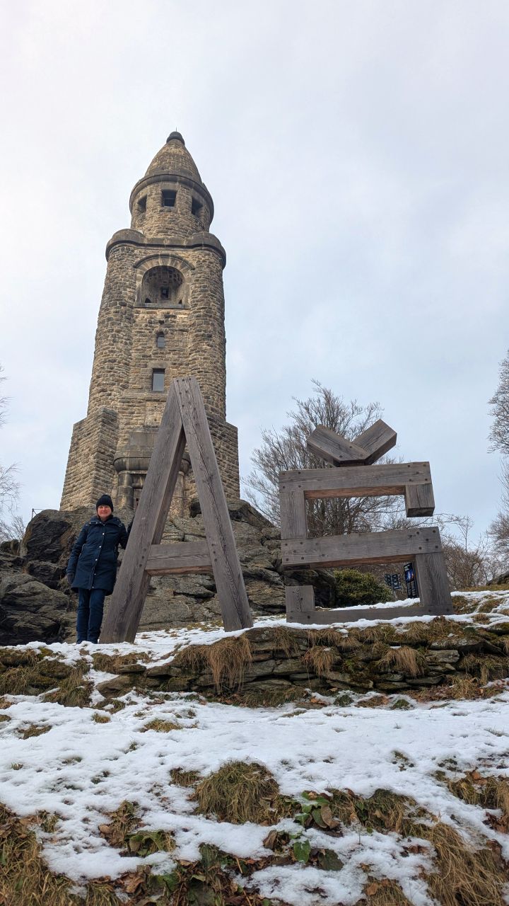 Auf dem Rückweg kehrten wir in einer Bäckerei ein und gönnten uns 2 Cappuccino und 3 süße Teile für 5,50 €. Auf Kopfsteinpflaster und kleinen Sträßchen ging es dann zu einer Sportanlage, von wo aus wir zum Hainbergturm (heute Bismarckturm) spazierten. Einen Schlüssel zur Turmbesteigung bekamen wir in einem Sportgeschäft am Sportplatz – Insidertipp von der Touristeninfo.
