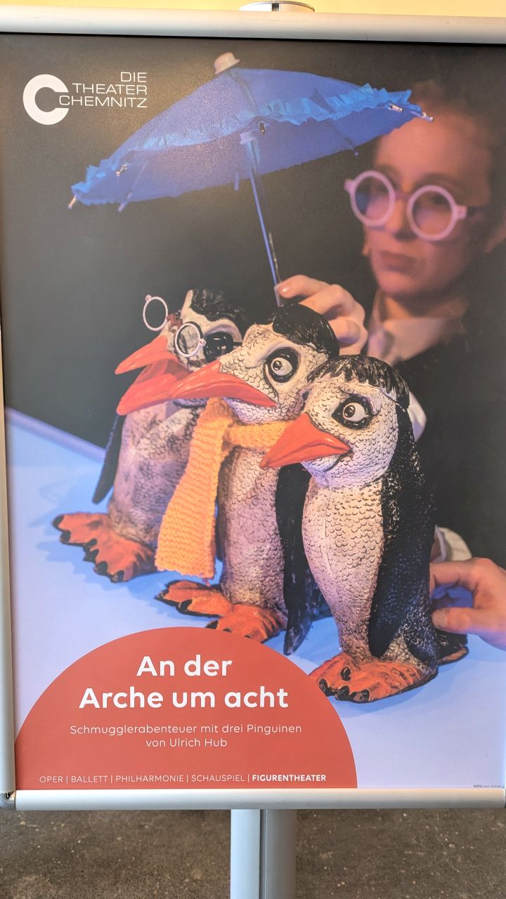 Das Stück hieß “An der Arche um acht” und handelt von 3 Pinguinen, die Freunde sind, aber sich auch kräftig streiten können. Eine Taube kündigt zwei von ihnen die Sintflut an und überreicht ihnen Tickets für die Arche. Es sind aber nur zwei Tickets! Was sollte mit ihrem Freund passieren? Schnell sind sie sich einig, dass sie ihn an Bord schmuggeln müssen, und zwar in einem Koffer bzw. einer Kühltasche – was ihnen dann auch gelingt. Die Puppenspieler waren zugleich auch Schauspieler, verschiedene Effekte wurden über zwei Overheadprojektoren erzielt und es gab mehrere nette Gesangseinlagen. Es hat uns sehr gut gefallen, obwohl es ein “Familienstück” ist und zwei Schulklassen die Aufführung mit uns besuchten. Was uns sehr positiv auffiel war, dass die Schüler auf ihre Lehrer hörten und der Theaterbesuch sehr gesittet und geordnet über die Bühne ging. Das Stück dauerte eine knappe Stunde und wir hatten noch ein nettes Gespräch mit einem Ehepaar aus Sachsen, die auch nur noch für diese Vorstellung Karten bekommen hatten.
