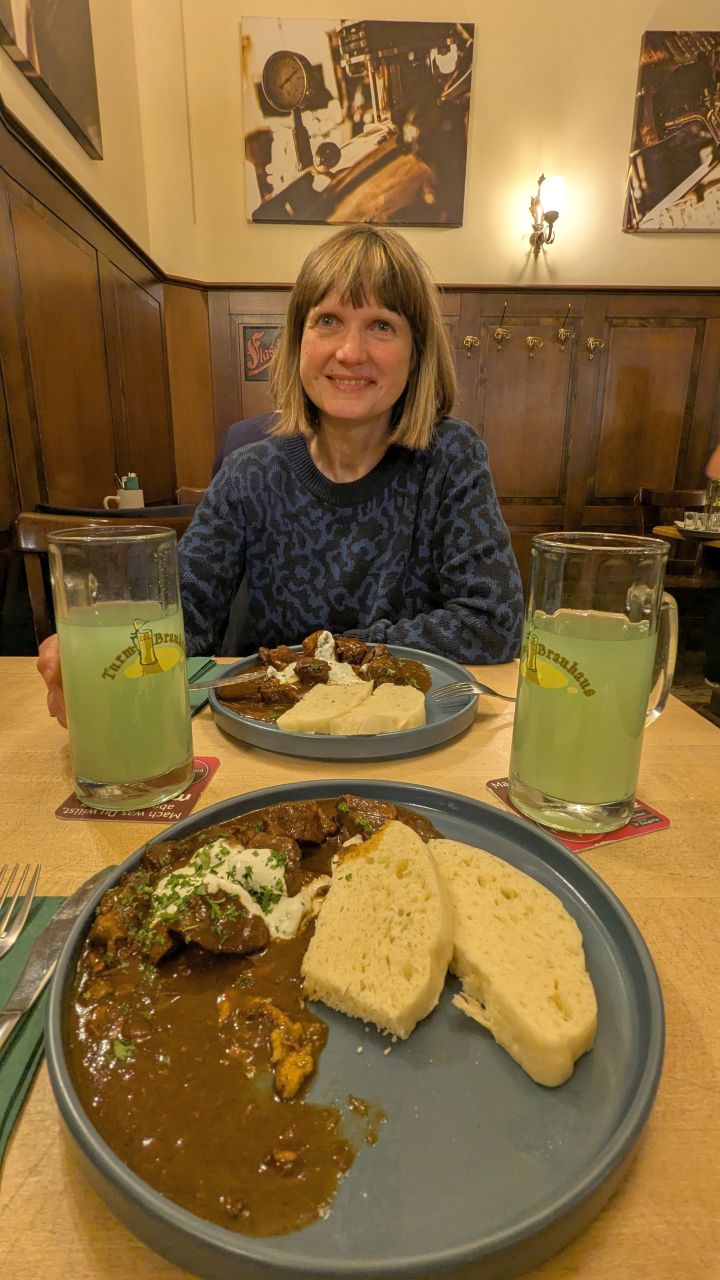 Die Wahl fürs Abendessen fiel auf das Turm-Brauhaus. Es ist sehr gemütlich eingerichtet mit zwei großen kupfernen Braukesseln in der Mitte, wo man laut Beschreibung dem Braumeister auf sein Handwerk schauen kann. Dieser war aber nicht vor Ort, zumindest konnten wir keinen sehen. Aber wir bekamen einen Tisch, wurden sehr schnell bedient und aßen gutes Gulasch mit Serviettenknödeln – der Sauerbraten war leider schon aus.