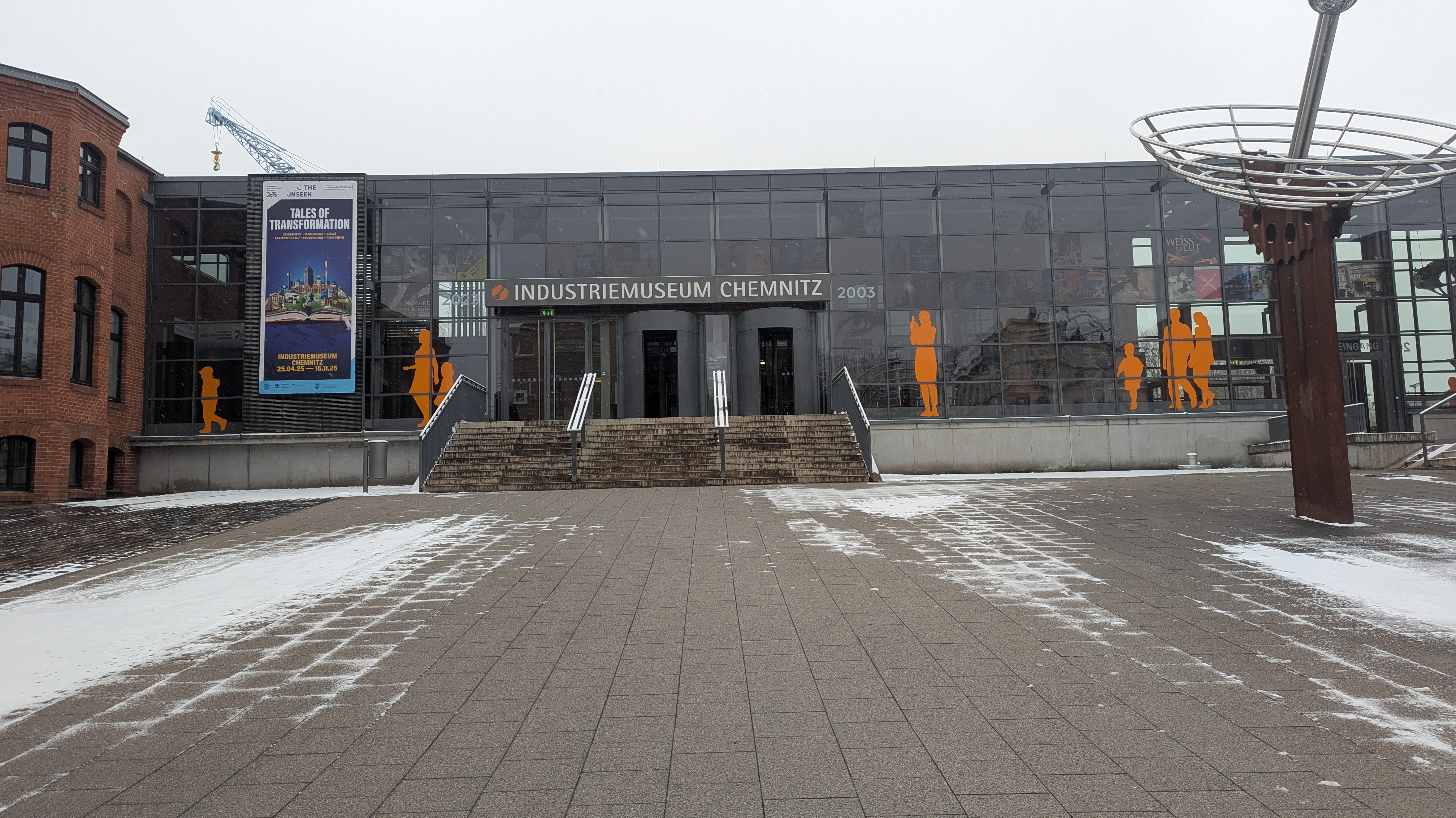 Heute erwartete uns ein trüber Wintertag, vormittags noch leichter Schneefall, nachmittags trocken und Temperaturen im leichten Minusbereich. Das Wetter war uns aber nicht so wichtig, da wir heute das zweite große Museum besuchen wollten, das Industriemuseum Chemnitz. Der Fußweg dorthin dauerte 25 Minuten, die wir warm angezogen gut überstanden und um 10:15 Uhr dort ankamen.
