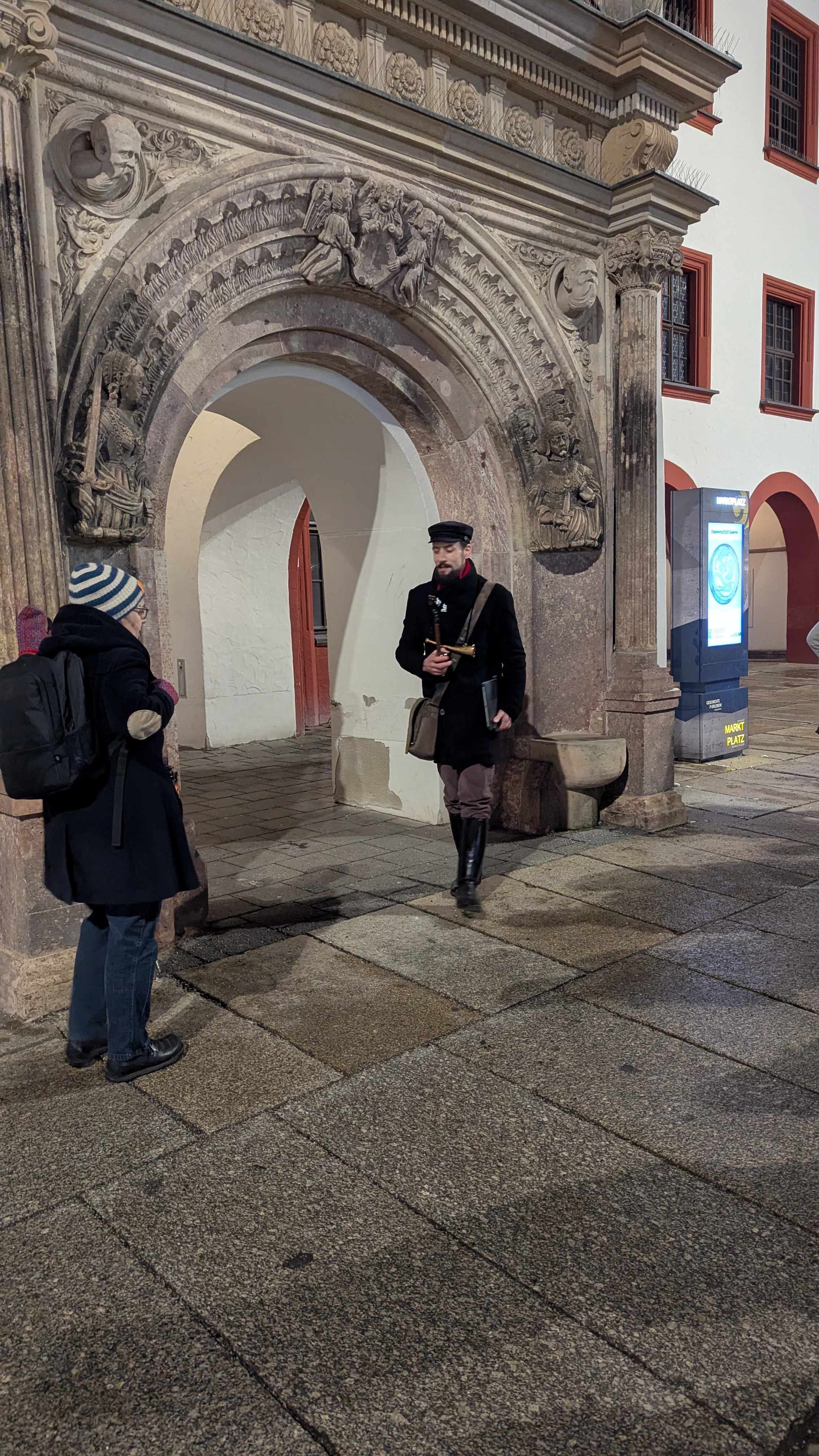 Udo machte sich um 17:30 Uhr noch einmal auf ins Stadtzentrum, um an einer Nachtwächterstadtführung teilzunehmen. Xenia blieb in der Berta und schaute sich einen Vortrag von einem Seminar an, den sie am Dienstagabend verpasst hatte.