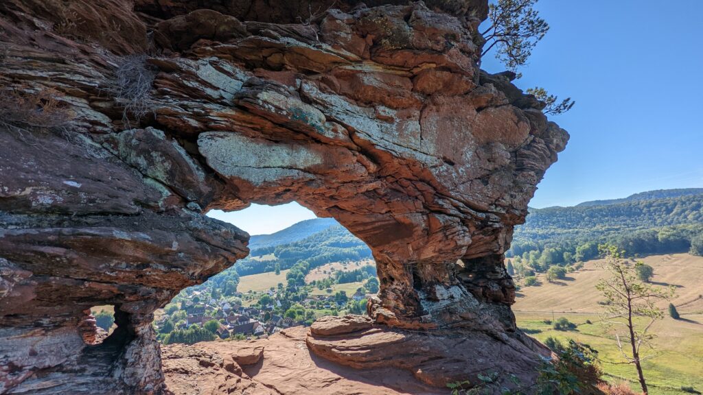 Zuerst machten wir allerdings noch einen Abstecher in die andere Richtung zum einem Lochfelsen ganz in der Nähe unseres Platzes. Man sieht ihn direkt vom Tal aus und wir erkannten Ähnlichkeiten mit der Küssenden Sau von Blaubeuren. Wir radelten über grenzwertige Waldwege bis hinauf zum Felsen und genossen dort ein wunderbares Panorama.
