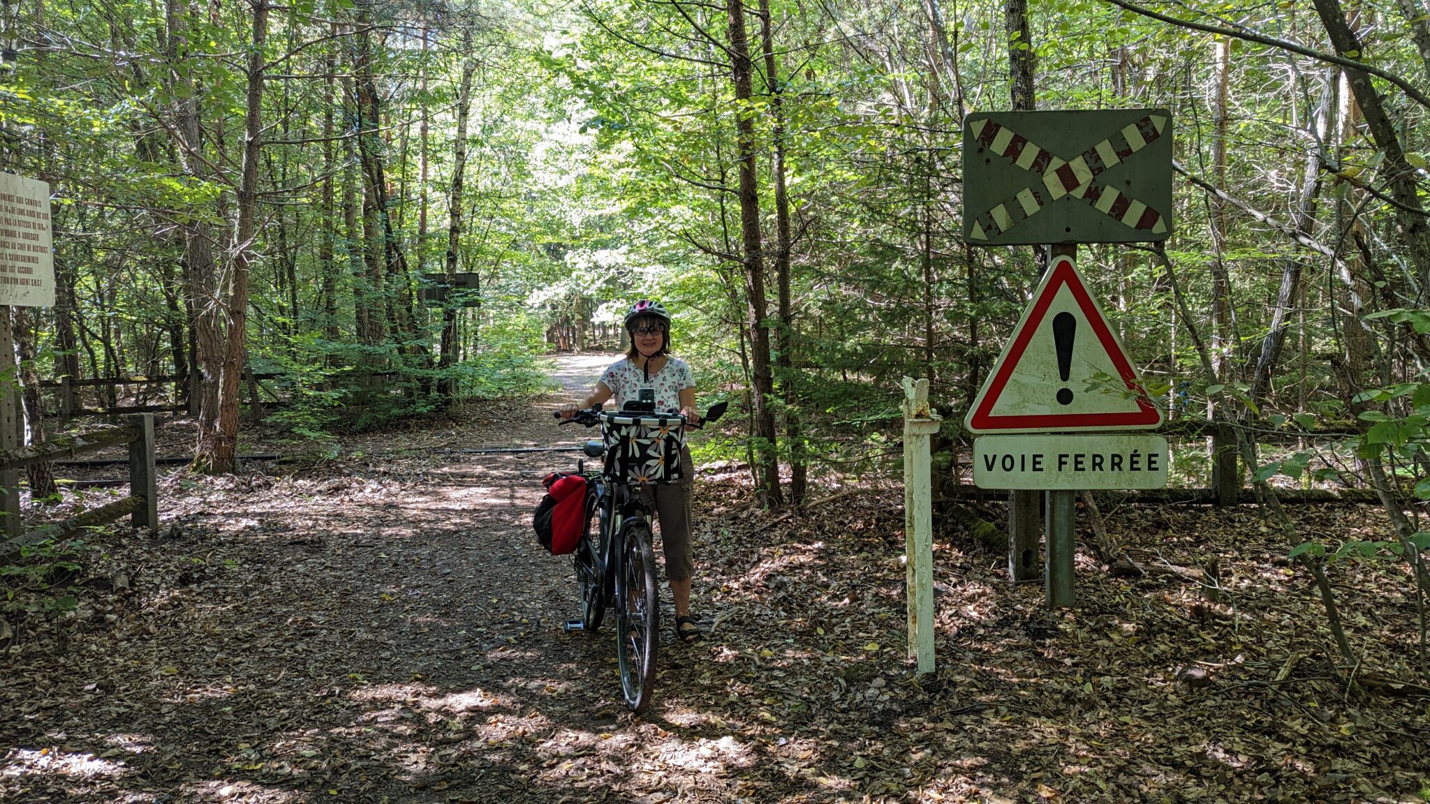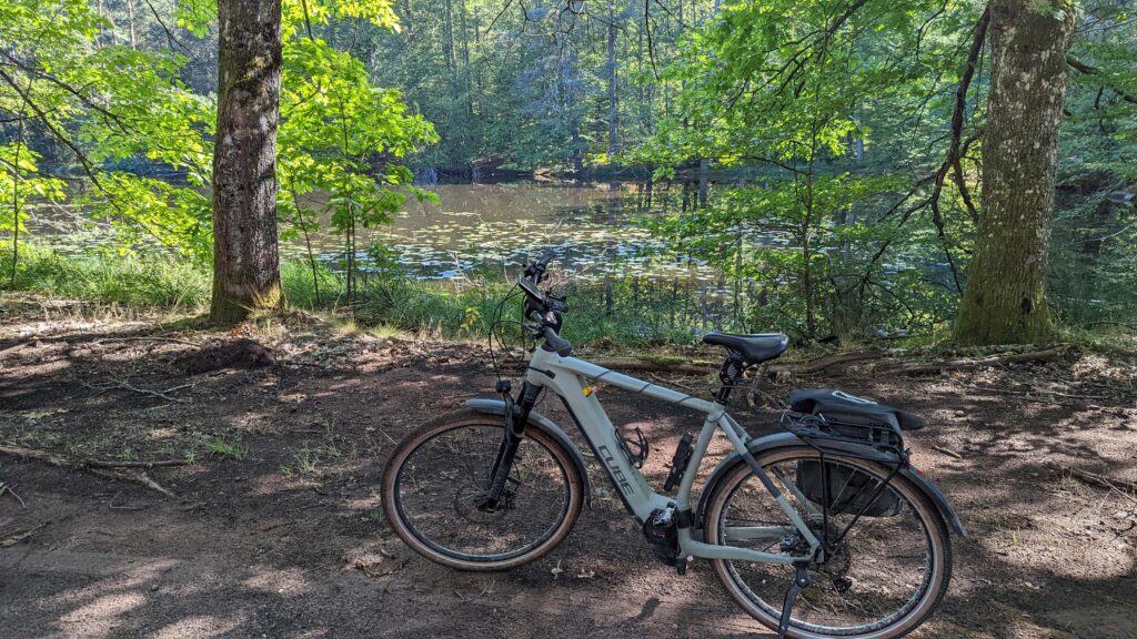 Um nicht auf Verkehrsstraßen radeln zu müssen, hatte Xenia Wege durch den Wald ausgesucht, die uns einiges abverlangten. Es war alles dabei: von wunderschönen geteerten Forstwegen bis zu holprigen Naturwaldböden über Wurzeln, teilweise sandig und steinig. Dazu ging es über weite Strecken auf und ab – so wie die Landschaft halt hier ist. Es war ziemlich abenteuerlich, aber gerade noch so machbar, dass es auch Xenia Spaß machte.
