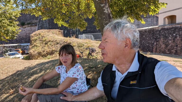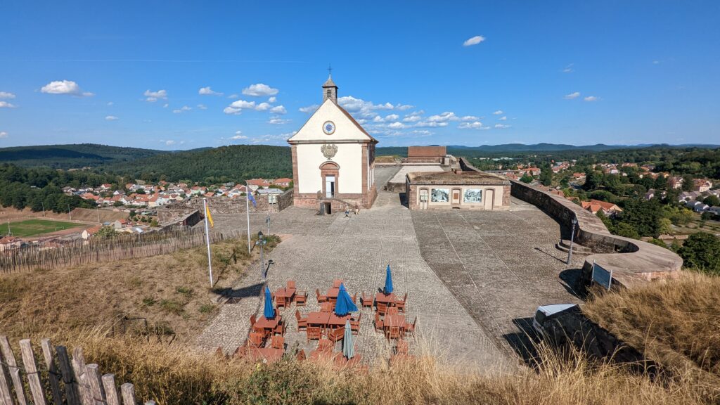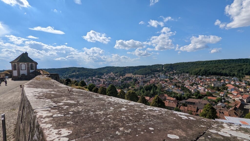 In Bitche angekommen besuchten wir einen Lidl, an dem wir vorbeikamen, und deckten uns mit Brot und süßen Teilchen ein. Diese aßen wir dann oben an der Zitadelle, wo wir uns unter einen Baum in den Schatten setzten und die Aussicht von oben genossen.