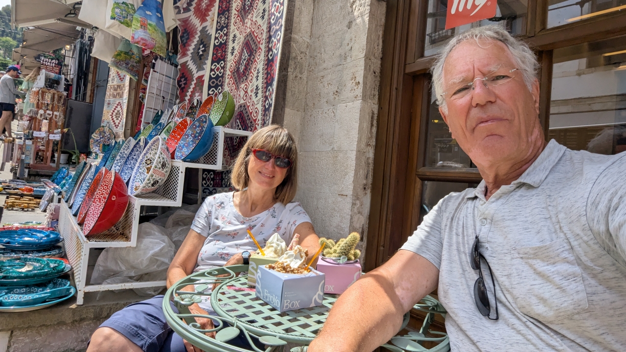 Nach dieser Stärkung führte uns unser Weg in die Altstadt und durch den dortigen Bazar. Hier war wieder einiges los und wir gönnten uns noch einen Frozen-Joghurt-Nachtisch, jetzt im Sonnenschein. Es machte Spaß, am Straßenrand zu sitzen und die vorbeigehenden Leute zu beobachten.