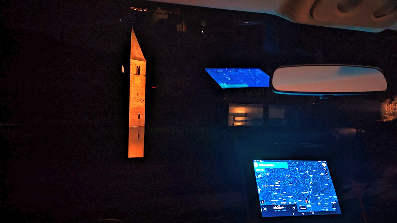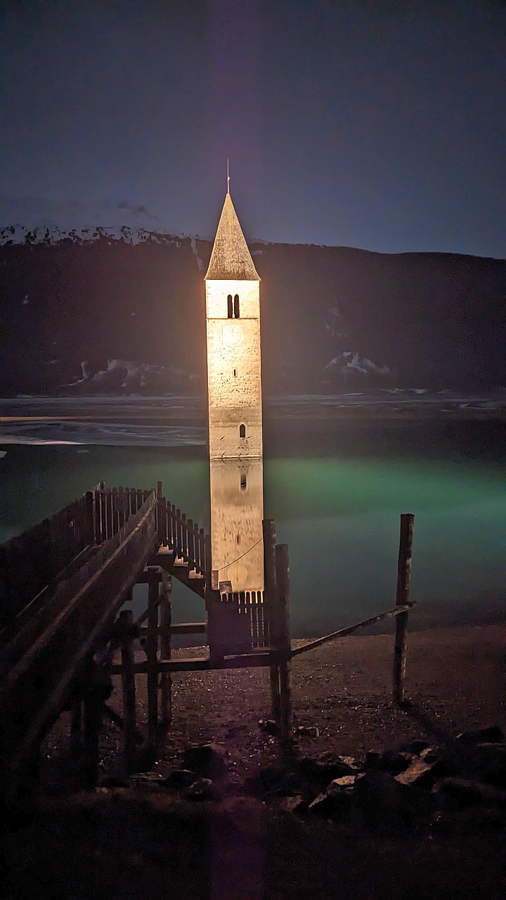 Um 16:45 Uhr fuhren wir weiter in Richtung Bodensee. In Lindau kauften wir am Grenzübergang zu Österreich eine Vignette und Xenia übernahm das Steuer bis zum Reschenpass. Das Wetter war recht ungemütlich, es regnete mal mehr mal weniger. Nach der italienischen Grenze am Reschensee legten wir gegen 21.30 Uhr einen kurzen Zwischenstopp ein. Es hatte aufgehört zu regnen, wir bewunderten den beleuchteten Kirchturm im Wasser und vertraten uns die Füße.