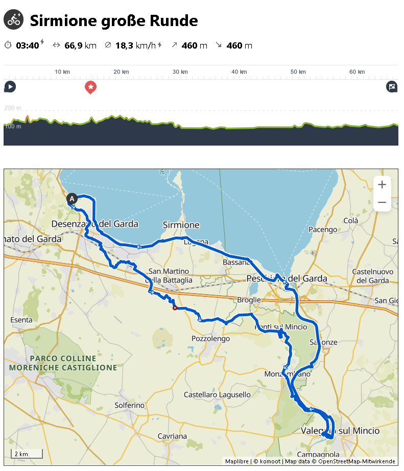 Da es morgens noch ziemlich frisch war, ließen wir uns Zeit und starteten erst gegen 10:30 Uhr zur unseren Radtour. Zuerst ging es durchs Hinterland bis Valeggio sul Mincio, dann am Fluss Mincio zurück an den Gardasee nach Peschiera del Garda und von dort aus am See entlang zurück zu unserem Wohnmobilstandplatz kurz nach Desenzano.