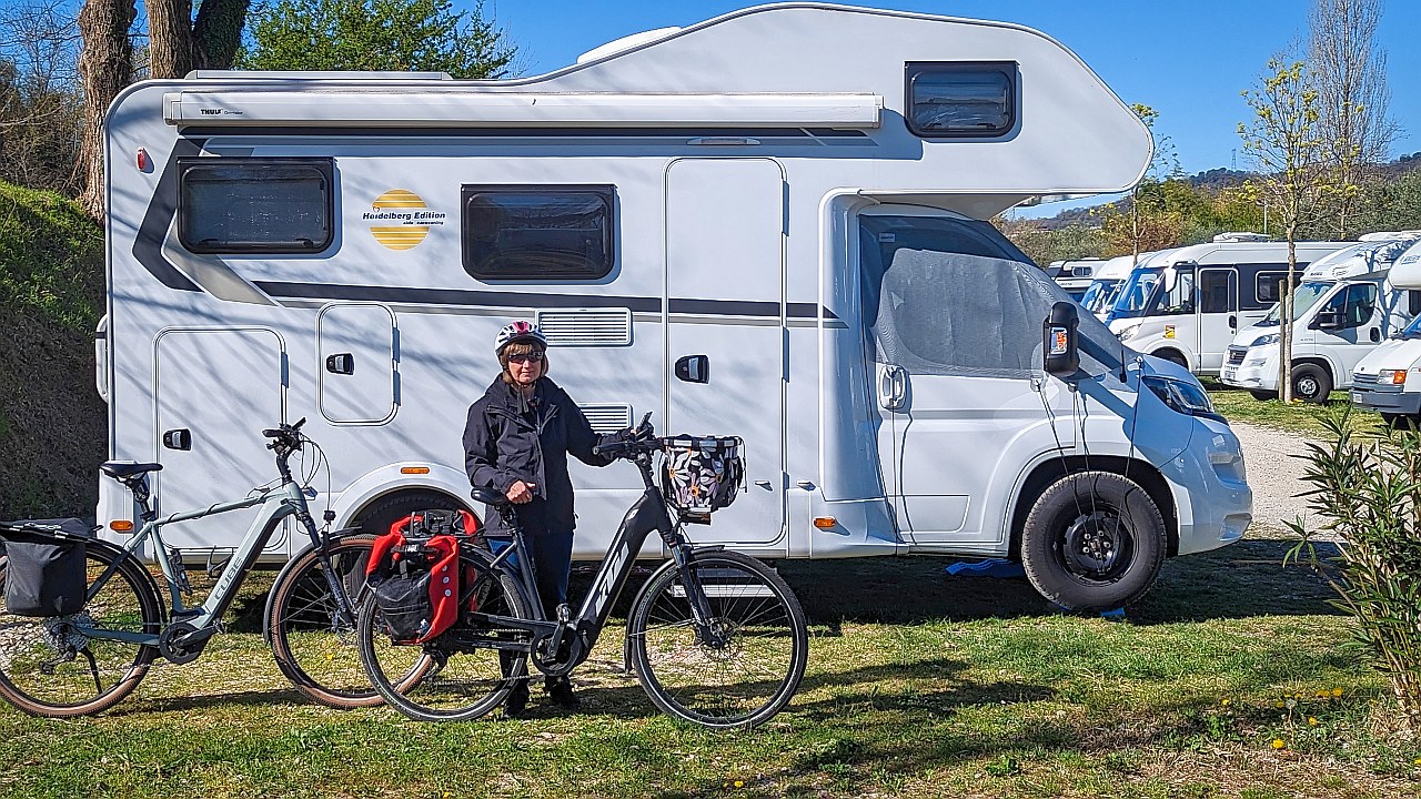 Nach 65 geradelten Kilometern kamen wir um 18:45 Uhr wieder bei unserer Berta an, duschten und machten uns zum Abendessen Schnitzel mit Salat und etwas italienischem Brot. Inzwischen hatte sich der Stellplatz komplett gefüllt. Alle Plätze, die wir sehen konnten, waren belegt. Da es jetzt auch merklich kühler geworden war, aßen wir im Wohnmobil und verbrachten dort den Rest des Abends.