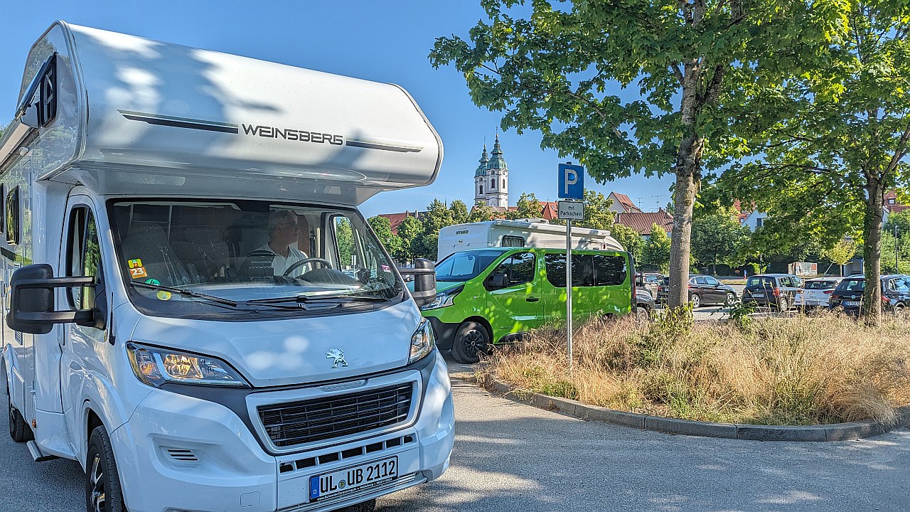 Wir fuhren von Aulendorf nach Bad Waldsee und stellten uns dort auf den großen Stadtparkplatz. Im hinteren Teil darf man umsonst parken, aber auch der Hauptteil ist am Wochenende kostenfrei. Wir suchten uns einen Schattenplatz, was bei der Sommerwärme sehr zu empfehlen war, und machten uns dort als erstes einen kalten Milchkaffee mit Erdbeerkuchen und einer Brezel. Wir telefonierten mit Eva und verabredeten uns für Dienstag in Dornbirn.