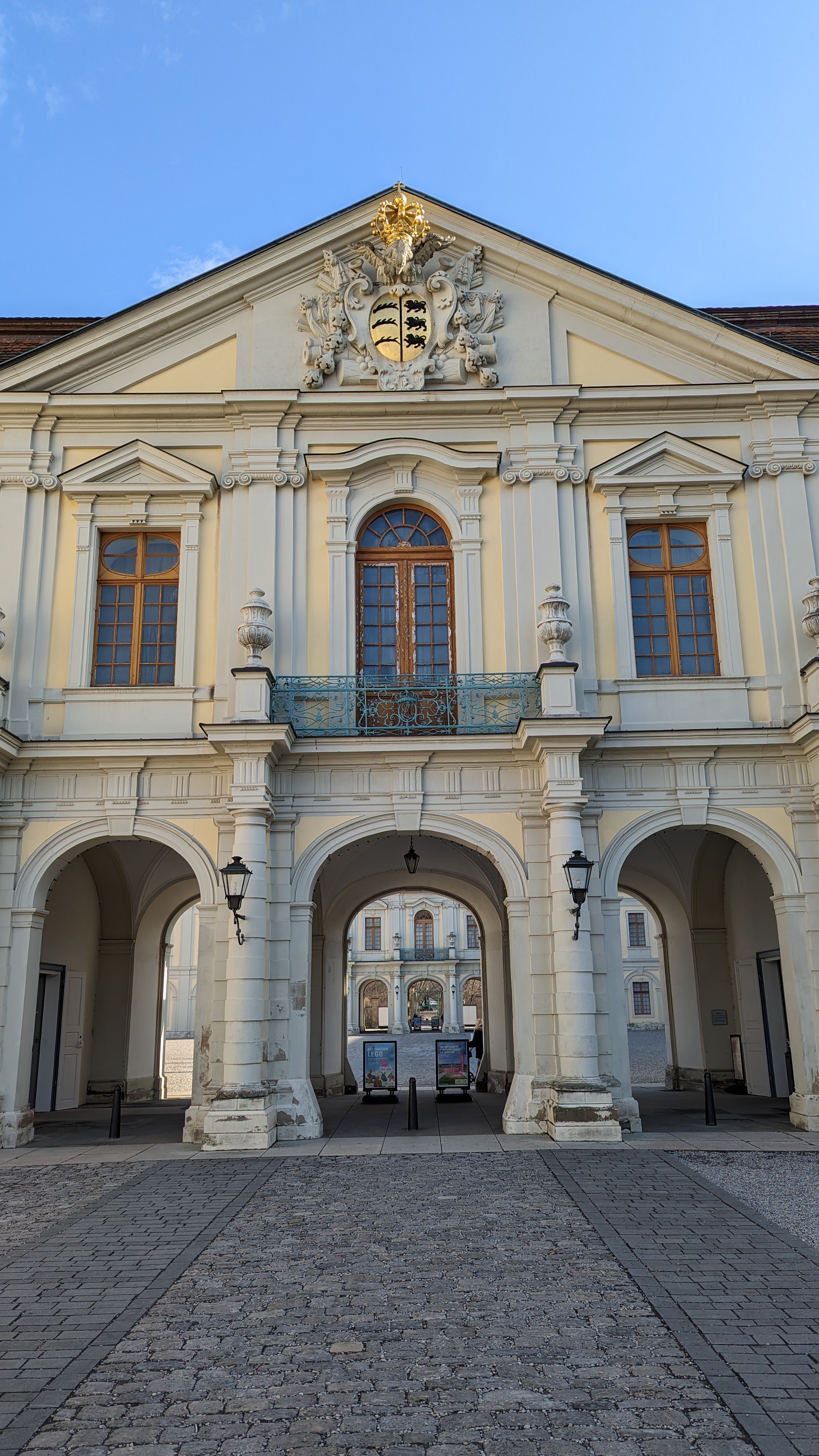 So waren wir nach einer guten Stunde im Schloss nicht undankbar, wieder nach draußen und in die Sonne zu kommen. Die gebuchte historische Stadtführung begann um 14 Uhr im mittleren Schlosshof – Zeit genug, um noch einen Imbiss zu uns zu nehmen. Wir setzten uns in die Sonne des Schlosscafés und genossen Kaffee mit Apfelstrudel. Einen Innenraum gab es nicht, aber in der Sonne war es ganz okay.