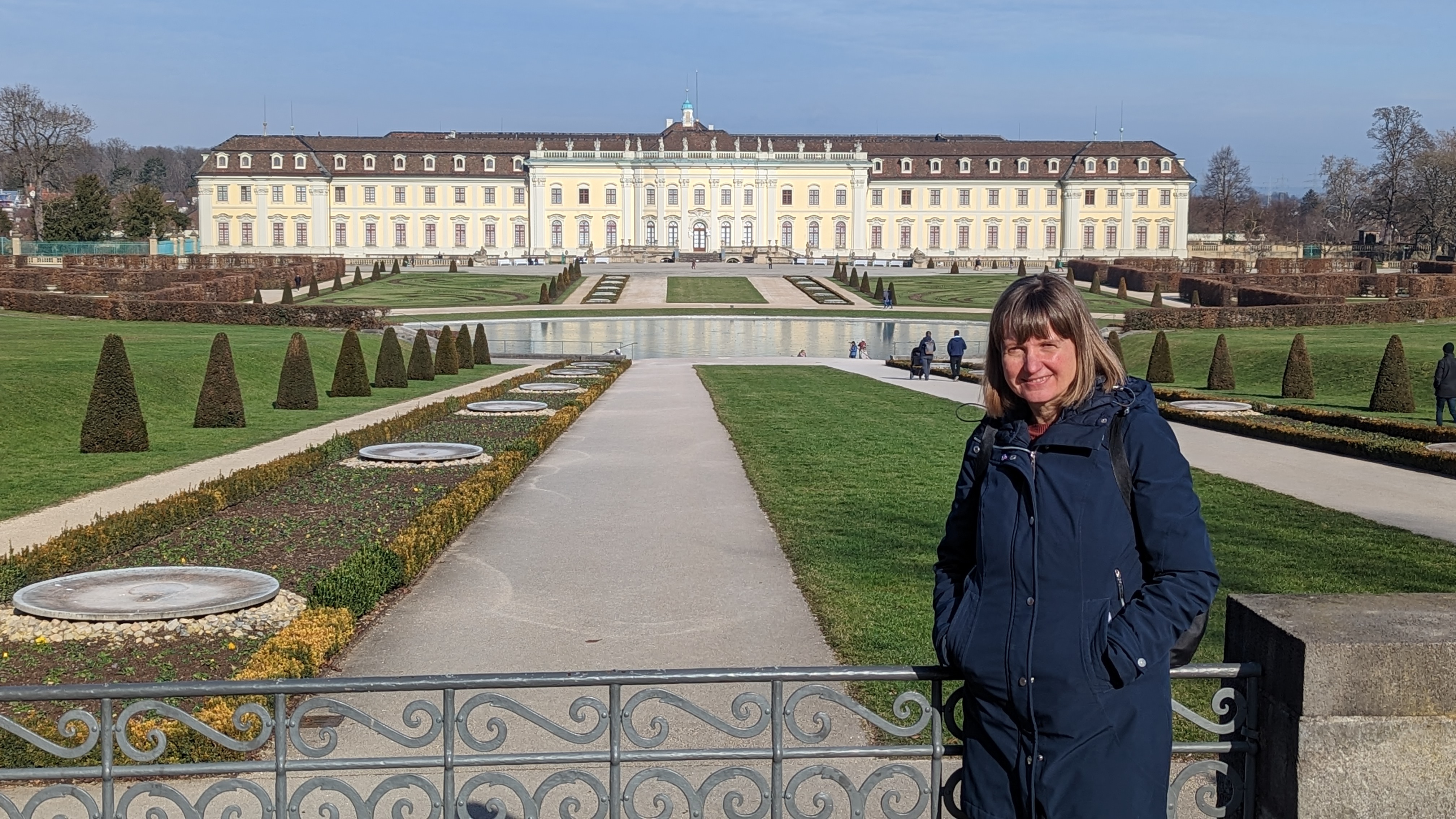 Los ging es zum Schloss, wo wir um 12 Uhr an einer Führung teilnahmen und neben Erklärungen zu den Räumen auch einiges zur Geschichte des Residenzschlosses, seinem Erbauer Herzog Eberhard Ludwig und seinen Nachfolgern Karl Alexander und vor allem Carl Eugen bekamen. Die Führerin - eine Französin, die sich als Wahlschwäbin vorstellte – machte ihre Sache sehr interessant und unterhaltsam. Besonders beeindruckend war ein sehr langer Saal, die Ahnengalerie, und ein imposanter Barockdurchgang von einem Trakt in den anderen, wo ein Hochzeitspaar gerade Bilder von sich machen ließ. Einziger Wermutstropfen war, dass es in den Zimmern und Sälen sehr kalt war – noch kälter als draußen! Die Führerin meinte, dass sie heute „nur“ 3 Hosen übereinander anhätte. In den letzten Wochen sei sie mit Mütze und Handschuhe unterwegs gewesen.