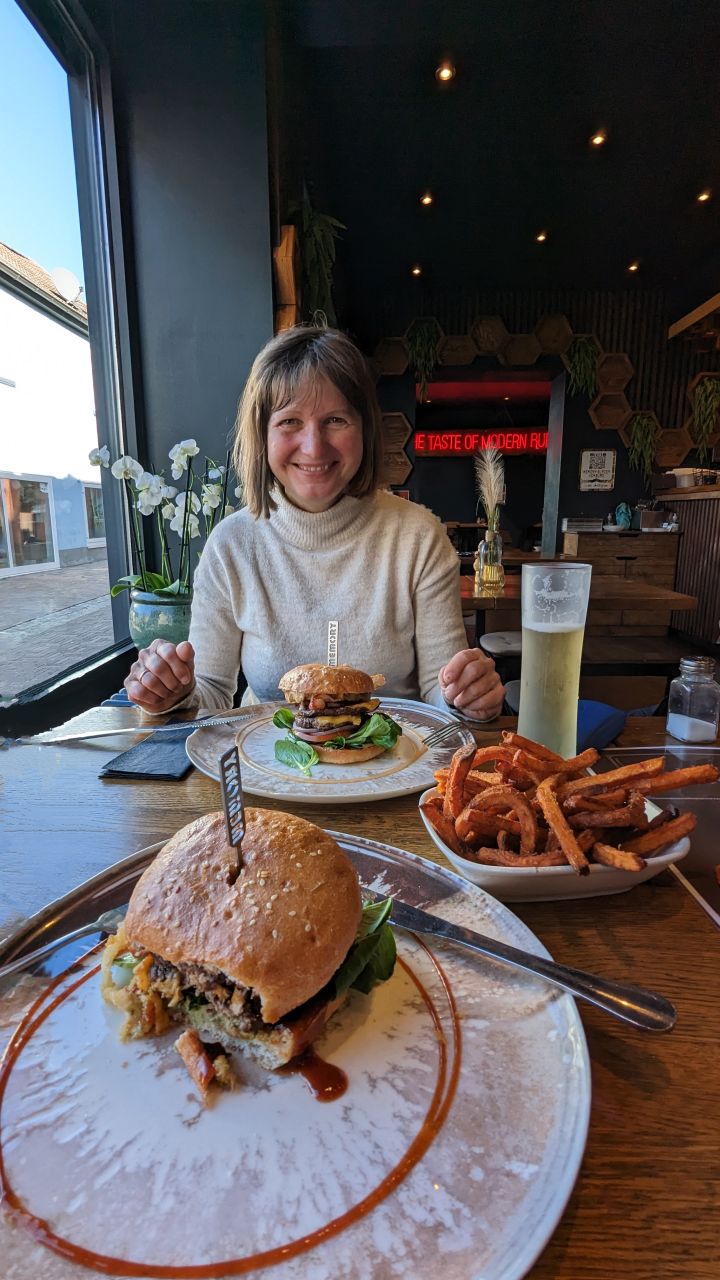 Um 13 Uhr machten wir uns an den Abstieg, aber nicht direkt zurück zum Auto, sondern in die Altstadt von Homburg. Schon auf der Festung hatten wir gelernt, dass es wegen massiver Luftangriffe im 2. Weltkrieg nur noch wenige alte Häuser in der Stadt gibt. Aber es war trotzdem nett, durchs Stadtzentrum zu bummeln. Gleich am Anfang stießen wir auf ein klasse Burgerrestaurant, was uns gerade recht kam. So verspeisten wir super gute Hamburger mit Süßkartoffelpommes. Frisch gestärkt und aufgewärmt (in den Höhlen hatte es auch nur 10 Grad) ging es dann zurück zur Berta. Unterwegs kauften wir noch ein paar Wecken fürs Abendessen.
