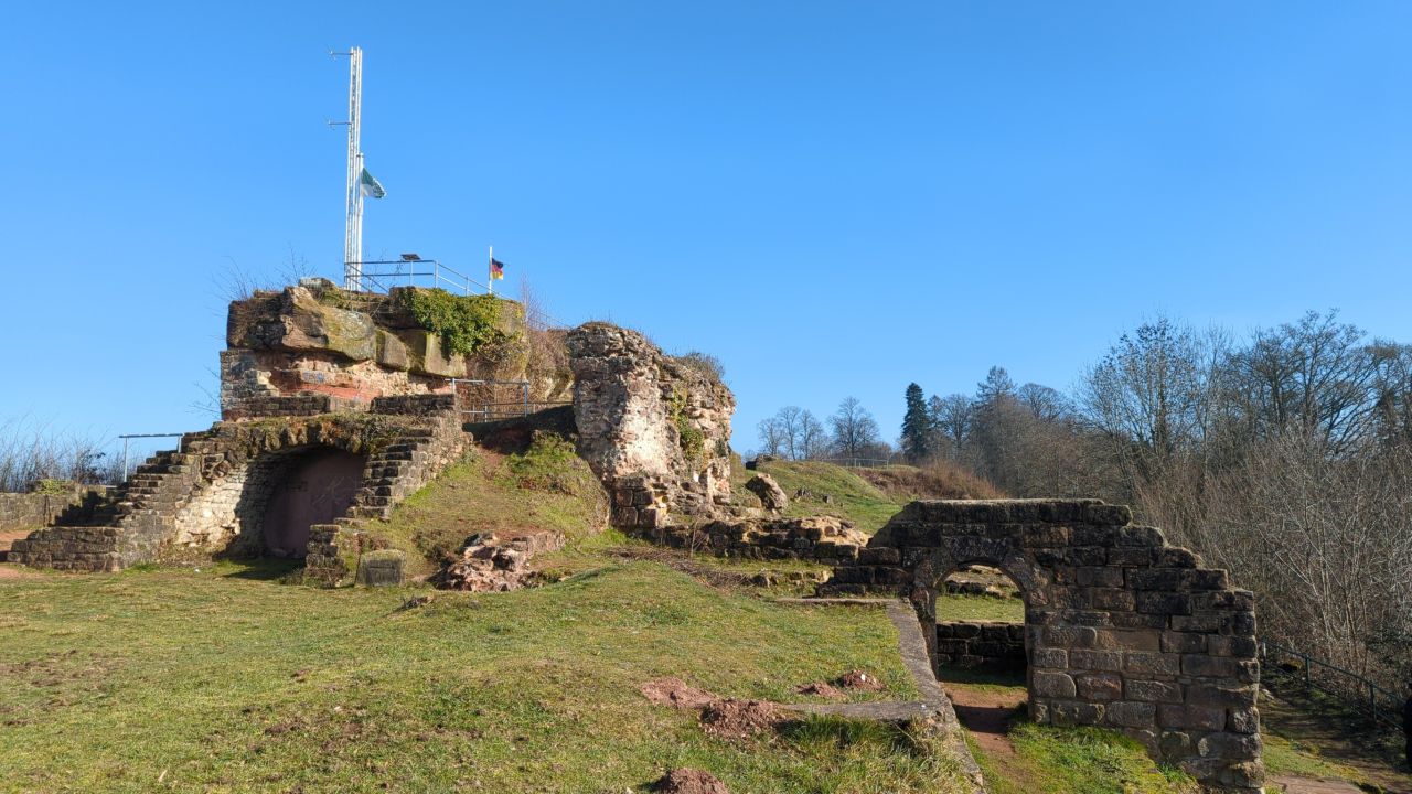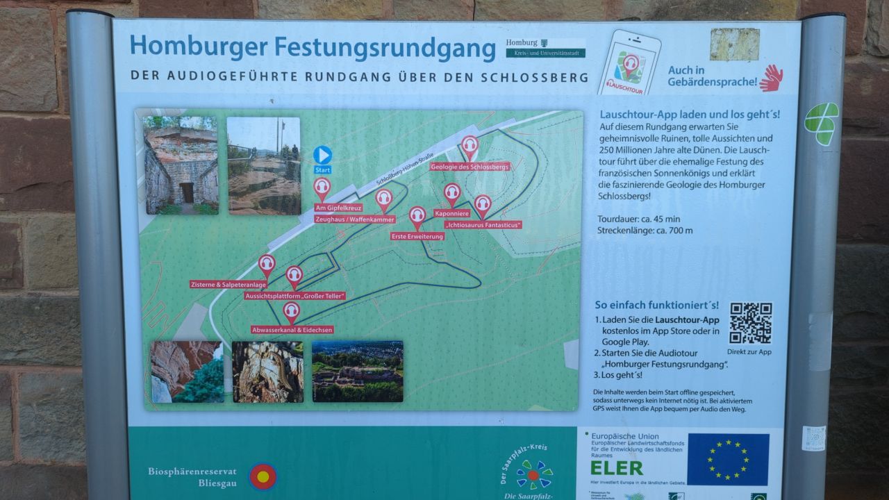 Unser Wanderweg führte uns die Kante entlang zur Festung Homburg. Dort entdeckten wir eine kostenlose „Lauschtour“, die wir uns herunterluden und so über 10 Stationen das Wichtigste zur Burgfestung und ihrer Geschichte erzählt bekamen. Blauer Himmel, Sonnenschein und Temperaturen, die in den zweistelligen Bereich kamen, machten das Vergnügen vollkommen.