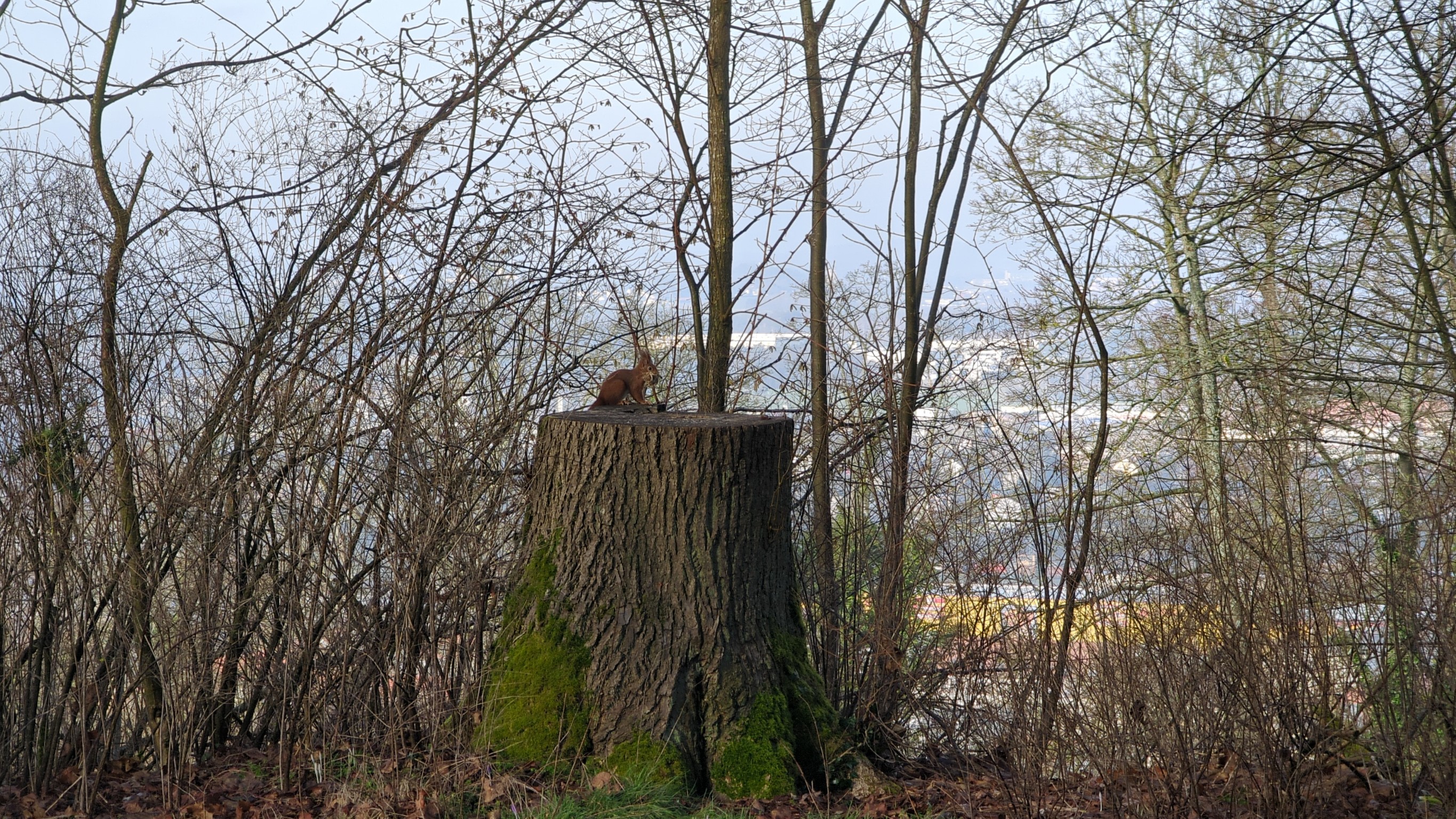 Um 9:45 machten wir uns auf den Weg nach Homburg. Das Parken gestaltete sich doch etwas schwieriger als gedacht, weil die Straße hoch zum Schlossberghotel und den Schlossberghöhlen gesperrt war. Udo fand unten einen Platz direkt an der Stelle, an der ein Wanderweg zum Schlossberg hochführt. Den nahmen wir dann und während dem Aufstieg durch den Wald kam die Sonne heraus.