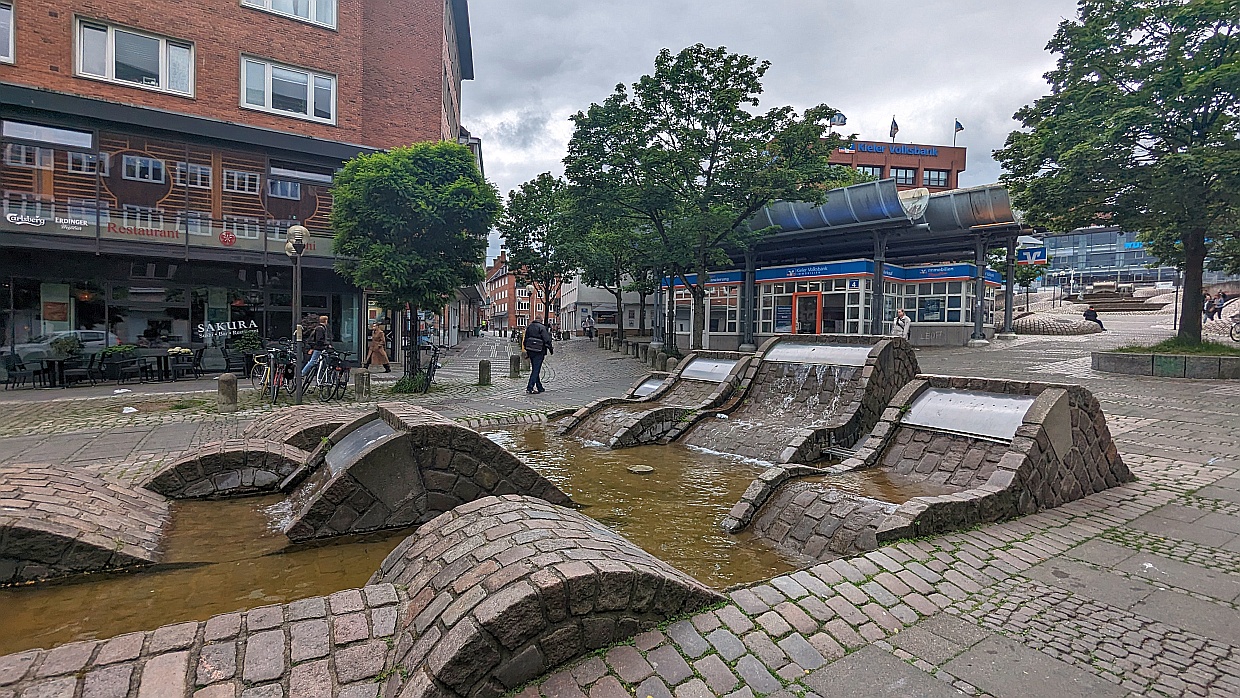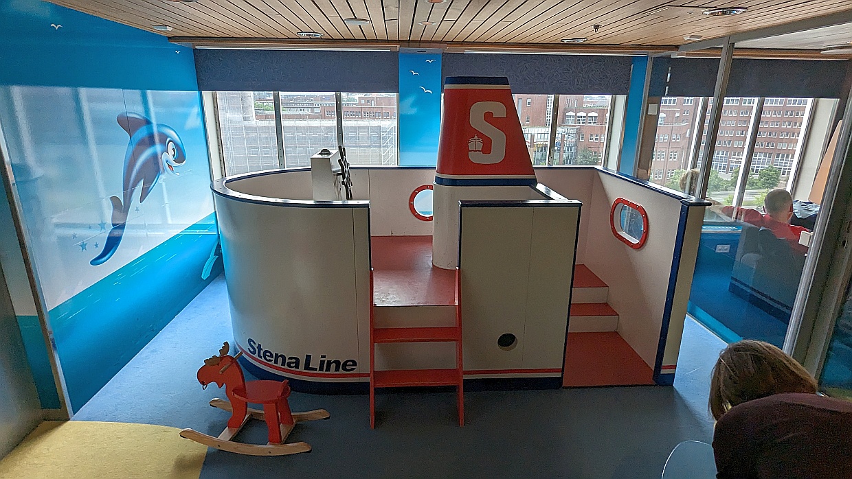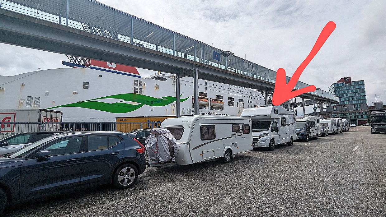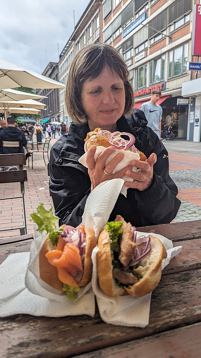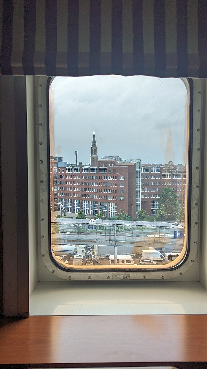 So gut bestückt und ausgerüstet fuhren wir an den Hafen ans Stena-Line-Terminal. Dort kamen wir um 13 Uhr an und bekamen die Auskunft, dass wir die Berta schon in eine der Wartespuren der Fähre stellen dürfen und um 17 Uhr wieder zum Boarding da sein müssen. Dort standen schon ein paar Autos und LKWs, zu denen wir uns gesellten und dann zu einer Runde in die Altstadt, die sich nur wenige hundert Meter vom Hafen entfernt befindet, aufmachten. Wir besuchten die St. Nikolai-Kirche, bummelten durch die Fußgängerzone und gönnten uns sehr gute Fischbrötchen.