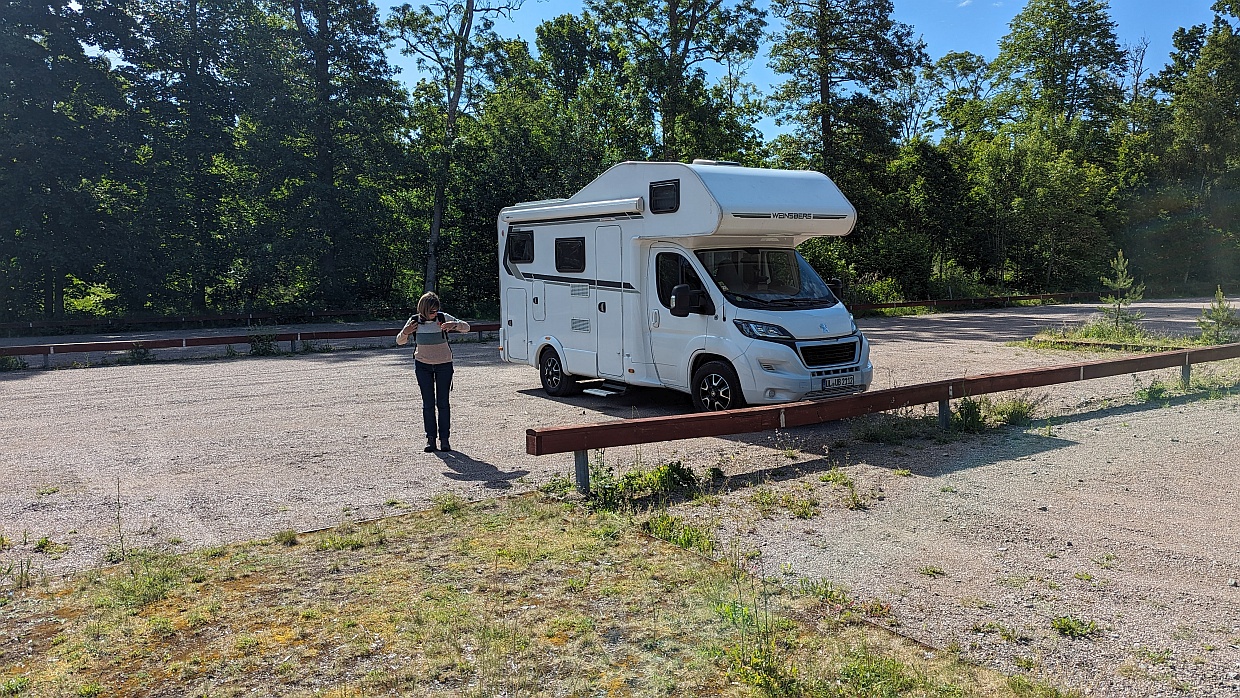 Da wir eine gute Wasserversorgung hatten, beschlossen wir, das auszunutzen und gönnten uns eine schöne Dusche, während es draußen regnete. Anschließend fuhren wir nochmals zur Versorgungsstation des Campingplatzes, leerten unser Klo, tankten Wasser, ließen Abwasser ab und machten uns auf den Weg zum nächsten See, dem Vättern. Dort wollten wir als erstes den Tiveden-Nationalpark besuchen. Nach einigem Hin und Her entschieden wir uns für einen freien Parkplatz kurz vor einem der drei Eingänge des Nationalparks. Auf dem Weg besuchten wir noch einen Lidl und deckten uns mit Lebensmitteln für die nächsten Tage und ein paar Erdbeeren ein.