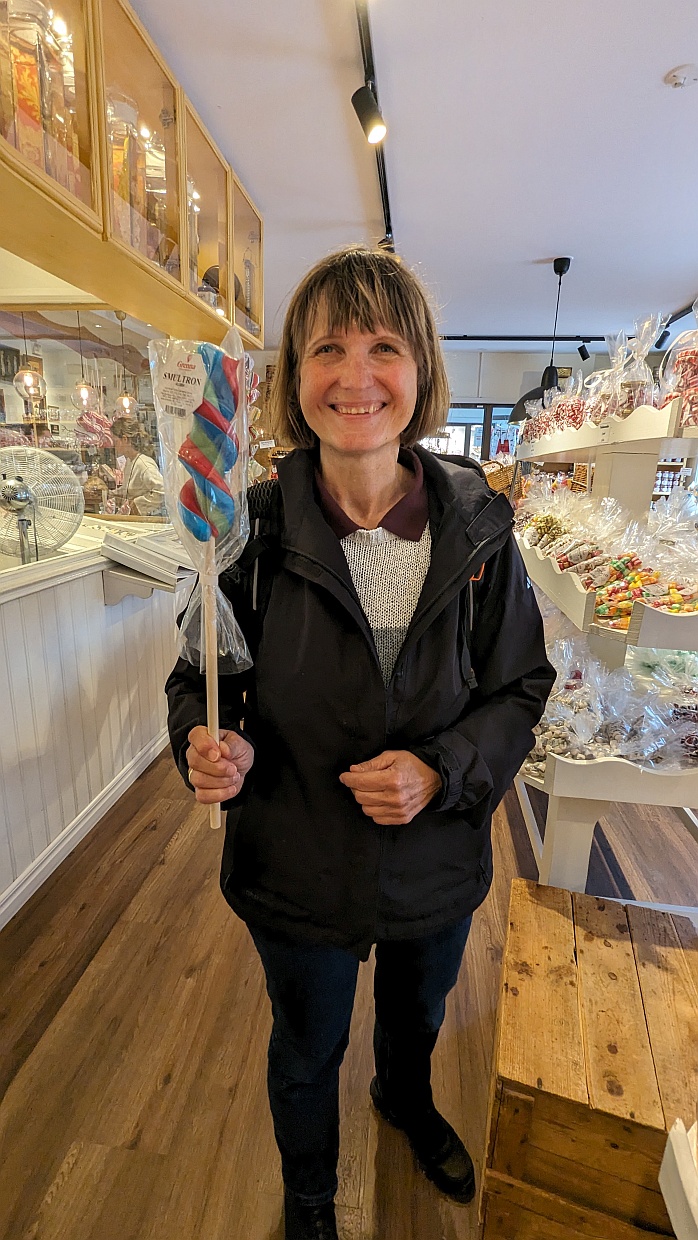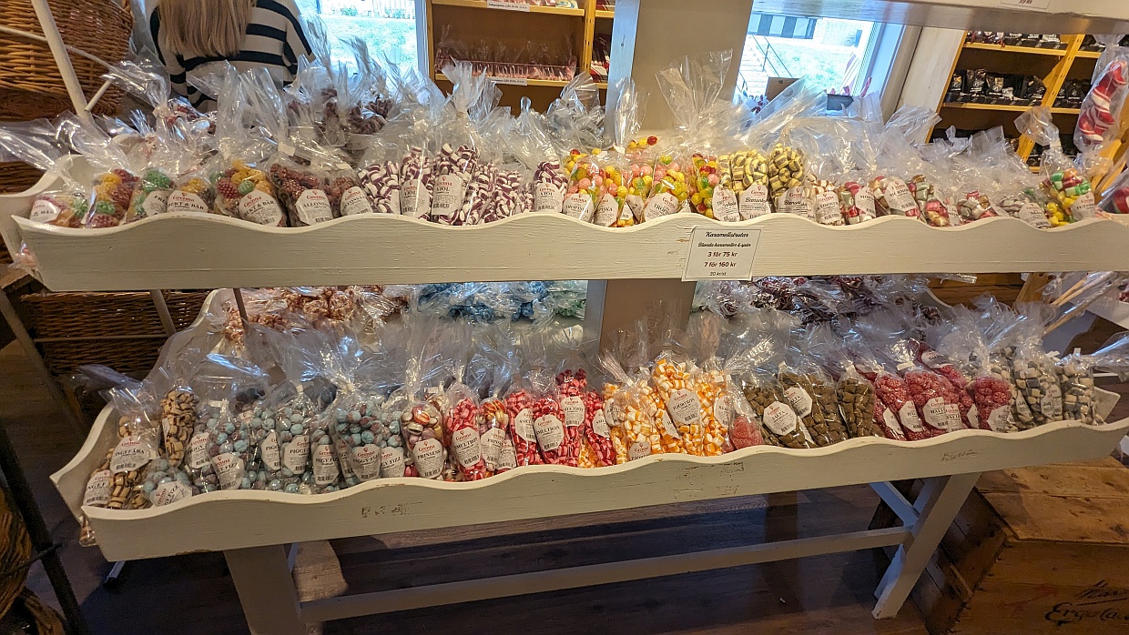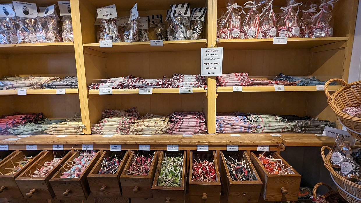 Dann schlenderten wir durch die Hauptstraße mit ihren vielen Süßigkeiten-Läden. In Gränna werden Zuckerstangen, Zuckerlutscher und Bonbons hergestellt. In einem Laden konnte man dem Zuckerbäcker bei der Arbeit zusehen. Dort haben wir uns zwei Stangen zum Versuchen gekauft. Sie schmeckten nicht schlecht, nur sehr süß ...