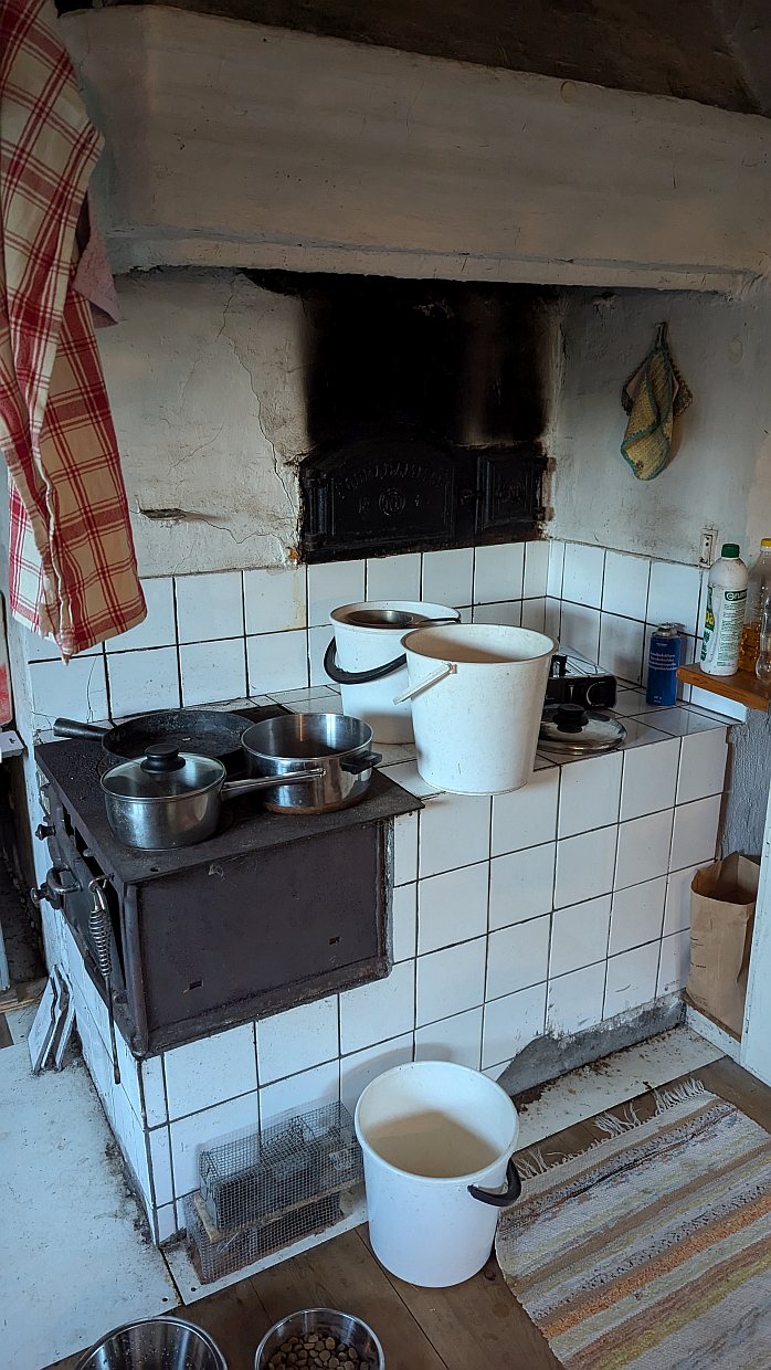 Zum Tagesabschluss machten wir noch alle zusammen bis 22:15 Uhr eine große Abendrunde über fast 5 km. Unterwegs kamen wir bei einem schwedischen Ehepaar vorbei, die in einem ganz alten Häusle mit Holzbackofen und Wasserpumpe im Garten wohnen. Sie haben einen großen schwarzen Hund, was zu allerhand Aufregung bei Elisa führte.
