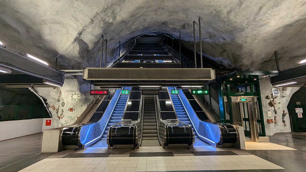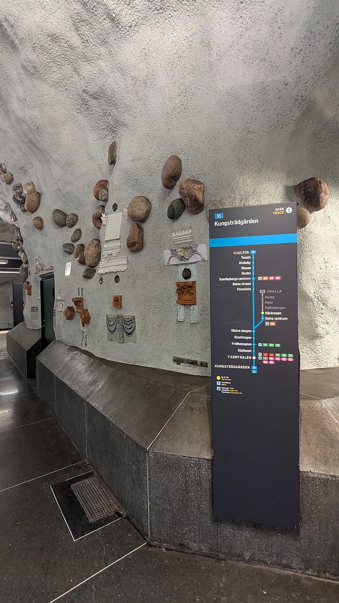 Heute blieb es den ganzen Tag bewölkt und nur mäßig warm, aber trocken. Nach einer guten Nacht in der Berta und einem gemeinsamen Frühstück in der Wohnung starteten wir gegen 10 Uhr mit der U-Bahn in die Innenstadt. Die Stockholmer U-Bahn ist sehr sauber und macht einen modernen Eindruck. Die einzelnen U-Bahnstationen wurden von Künstlern gestaltet und sind alle unterschiedlich.