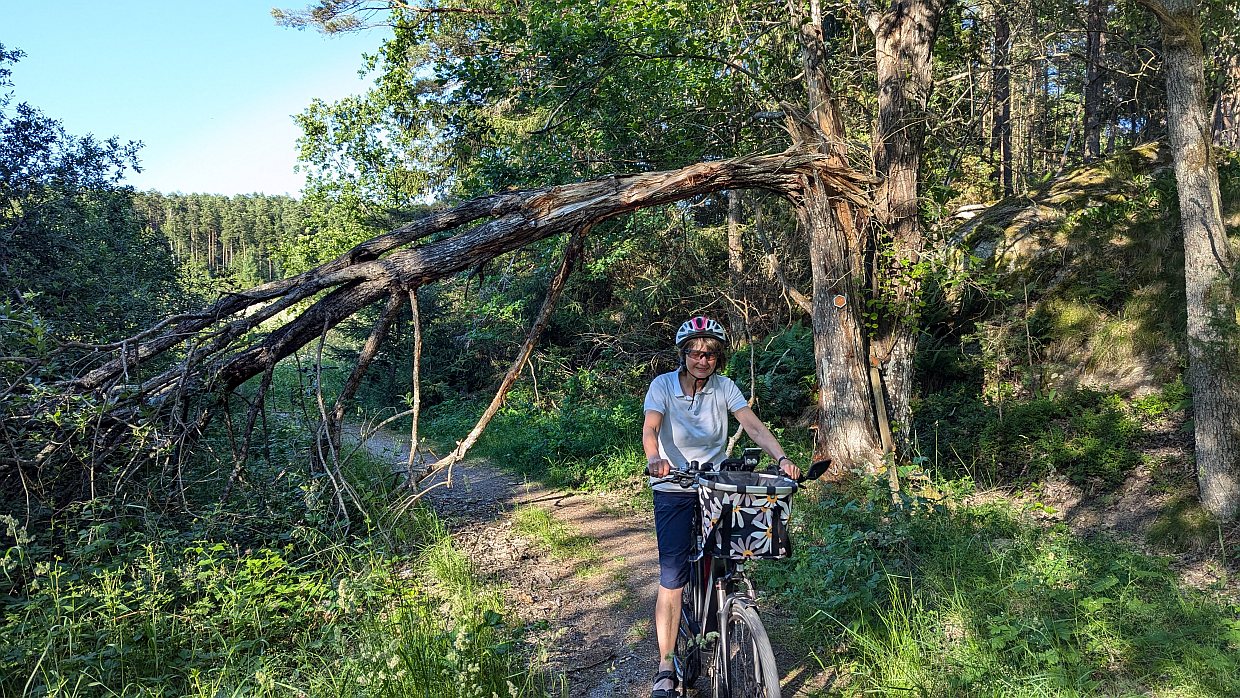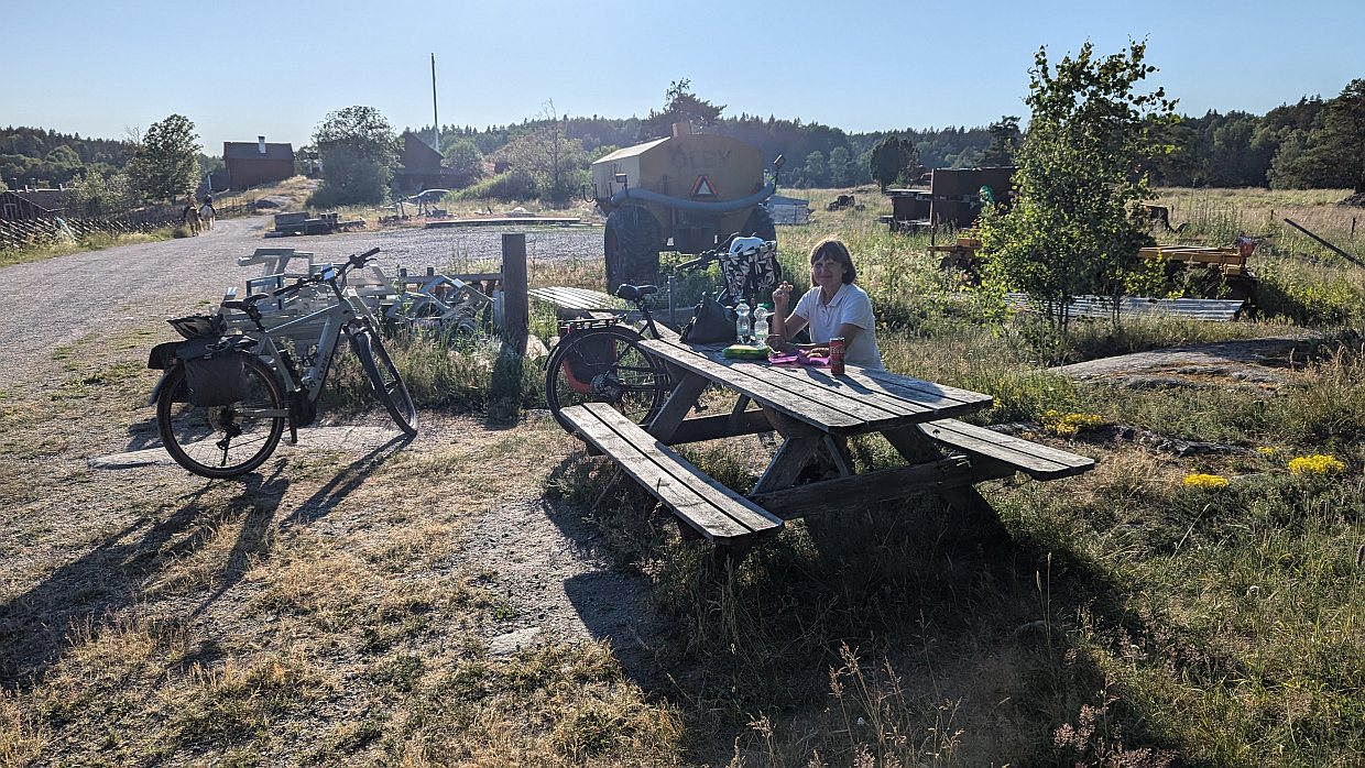 So ausgerüstet starteten wir kurz nach 18 Uhr zu einer Abendradrunde rund um den Nationalpark, teils auf wenig befahrenen Straßen, teils auf Schotter- oder Waldwegen oder auf Radwegen neben größeren Straßen. So bekamen wir einen Eindruck von der Gegend. An einem schönen Bänkle packten wir die Wecken aus und genossen unser Abendessen in der Abendsonne.