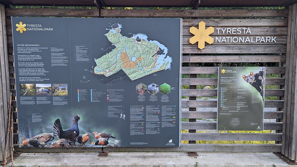 Auf dem Rückweg zur Berta gönnten wir uns im Café Notholmen ein Eis, dann fuhren wir ein paar Minuten weiter zu einem der Eingänge des Nationalparks Tyresta. Wir waren die Einzigen auf dem Parkplatz und machten zuerst einmal einen Kaffee mit den frisch gekauften süßen Stückle vom Coop.