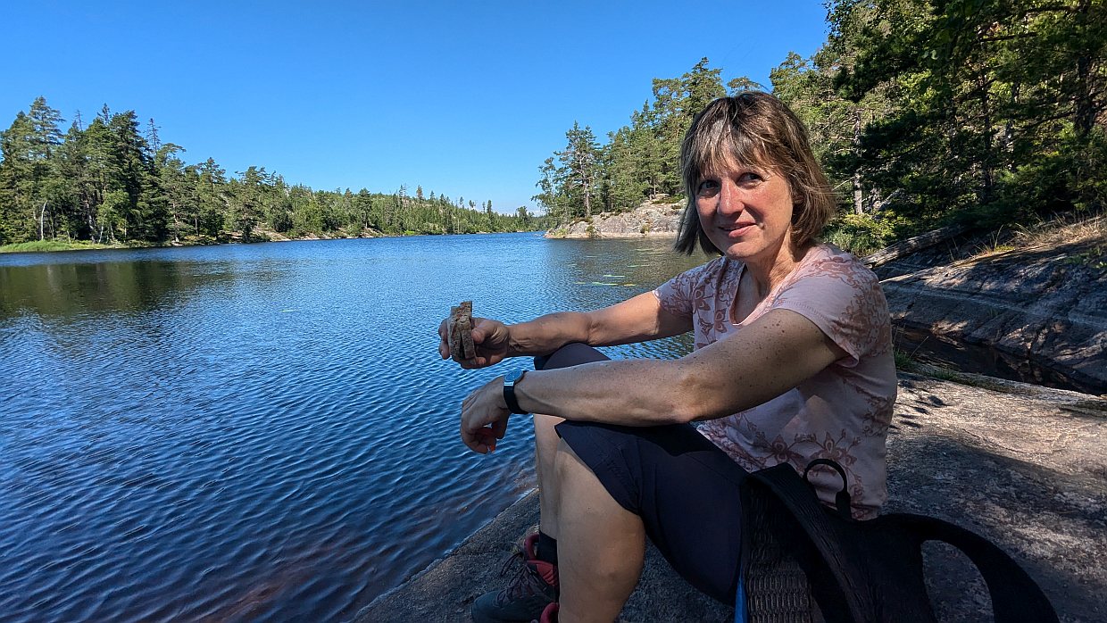 Nach einer guten Stunde Fußmarsch und ungefähr der Hälfte der Strecke machten wir Mittagspause an einem schönen Platz am zweiten See. Wir sahen in den Nachbarbuchten zwei weitere Paare, die Rast machten. Das waren die ersten Menschen, denen wir aus der Ferne begegneten.