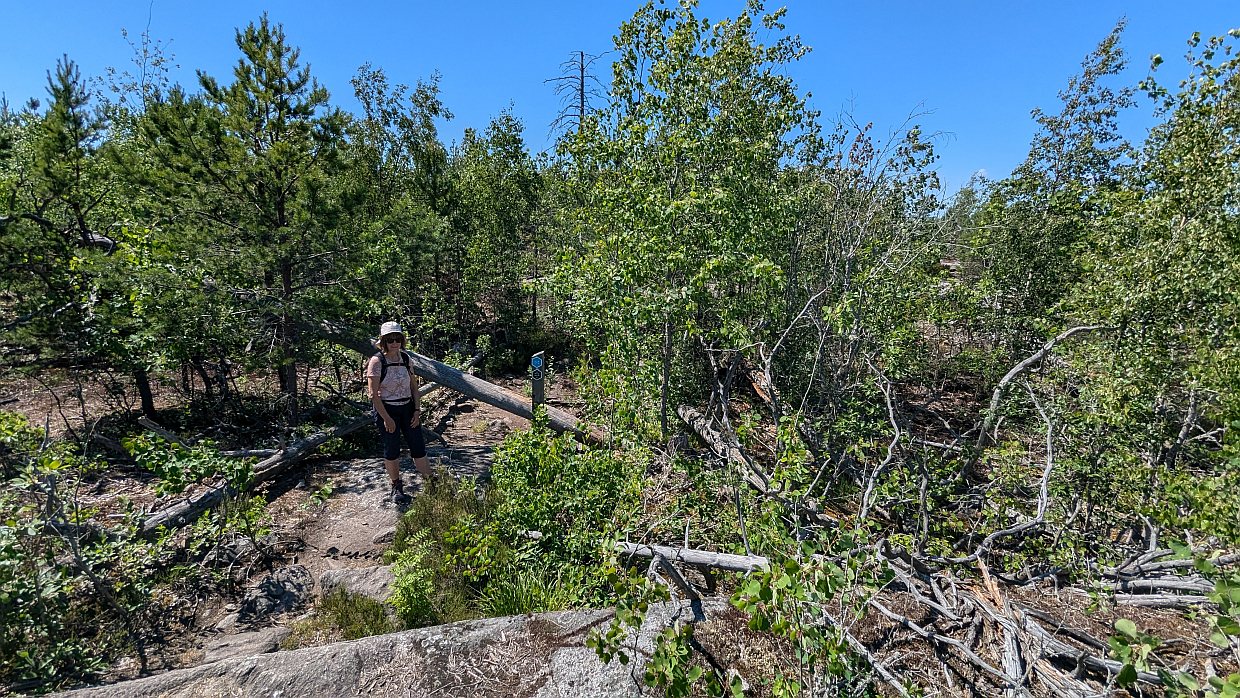 Unsere geplante Wegstrecke betrug knapp 12 km, was bei der Bodenbeschaffenheit schon eine gute Strecke ist. Udo hatte zwei Touren des Nationalparks kombiniert, so dass wir zwei größere Seen umrundeten und an weiteren kleinen Seen vorbeikamen. Den ersten Teil der Runde hatte er etwas anders gelegt als die vom Park vorgeschlagene Route. So umgingen wir ein Stück ziemlich ätzende Schotterstraße, auf der wir dann nur wenige hundert Meter zurücklegen mussten, und gingen dafür einen kleinen Pfad durch den Wald und an einem Hochmoor vorbei durch den Heidelbeerwald – so wie wir es lieben.