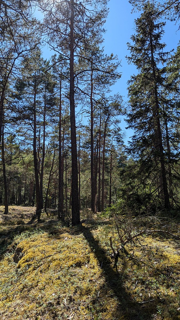 Tyresta ist ähnlich wie Tiveden ein Urwald mit Wurzel- und Steinewegen, wobei es in Tiveden größere Felsen und Steine gibt. Dafür hat Tyresta mehr Seen, Moorgebiete und auch einige Strecken auf Bohlenwegen. Wir hatten uns vorsorglich mit Sonnen- und Mückencreme eingecremt, haben dann aber keine Mücken gesehen. Dafür 2 Schlangen – eine größere und eine kleine – und ziemlich viele Ameisen.