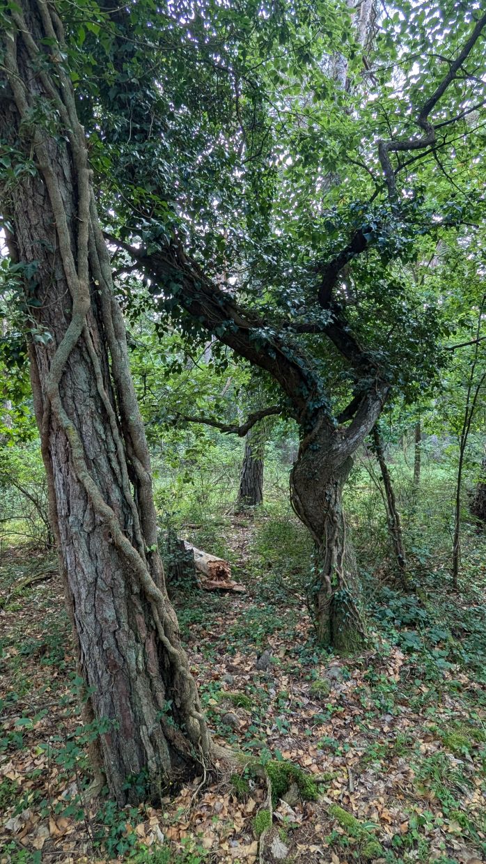 Dann um eine große Bucht herum ans Ostufer und dort wieder ganz in den Norden zum Trollkogen (Zauberwald), einem Kiefernwald mit alten, knorrigen, zum Teil vom Wind verformten oder mit Efeu umrankten Bäumen. Auf einem Schotterweg in der Mitte des Naturreservates ist Radfahren erlaubt, die anderen Wege sind zwar radtauglich, dürfen aber nur zu Fuß begangen werden.