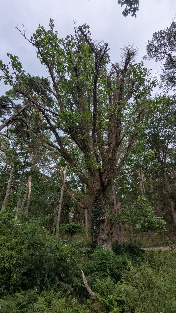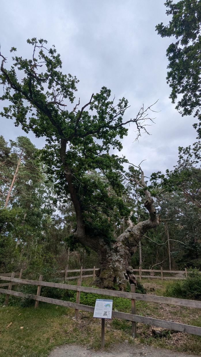 Wir nahmen den erlaubten Weg bis ganz in den Norden und setzten uns dort auf ein Bänkle mit Aussicht auf den Langen Erich auf der anderen Seite der Bucht. Dann ging es wieder zurück und auf einem kleinen Abschnitt setzten wir uns über das Radverbot hinweg und radelten zum Trolleken, einer 1000-jährigen Eiche.