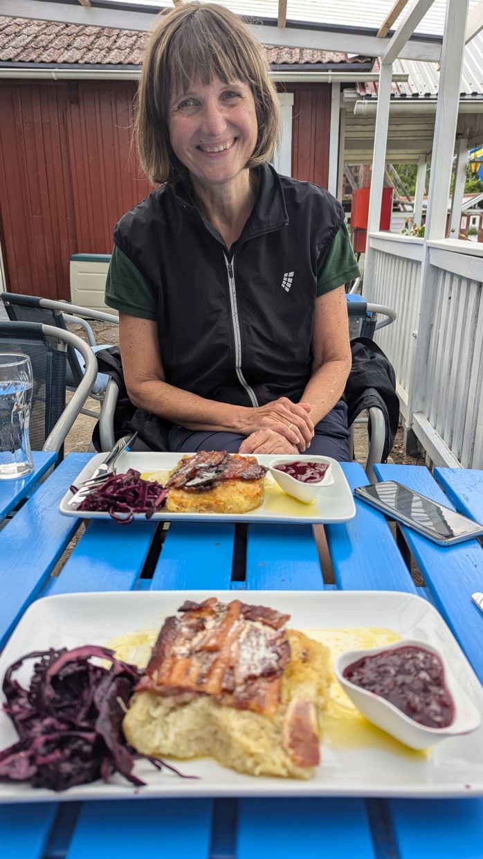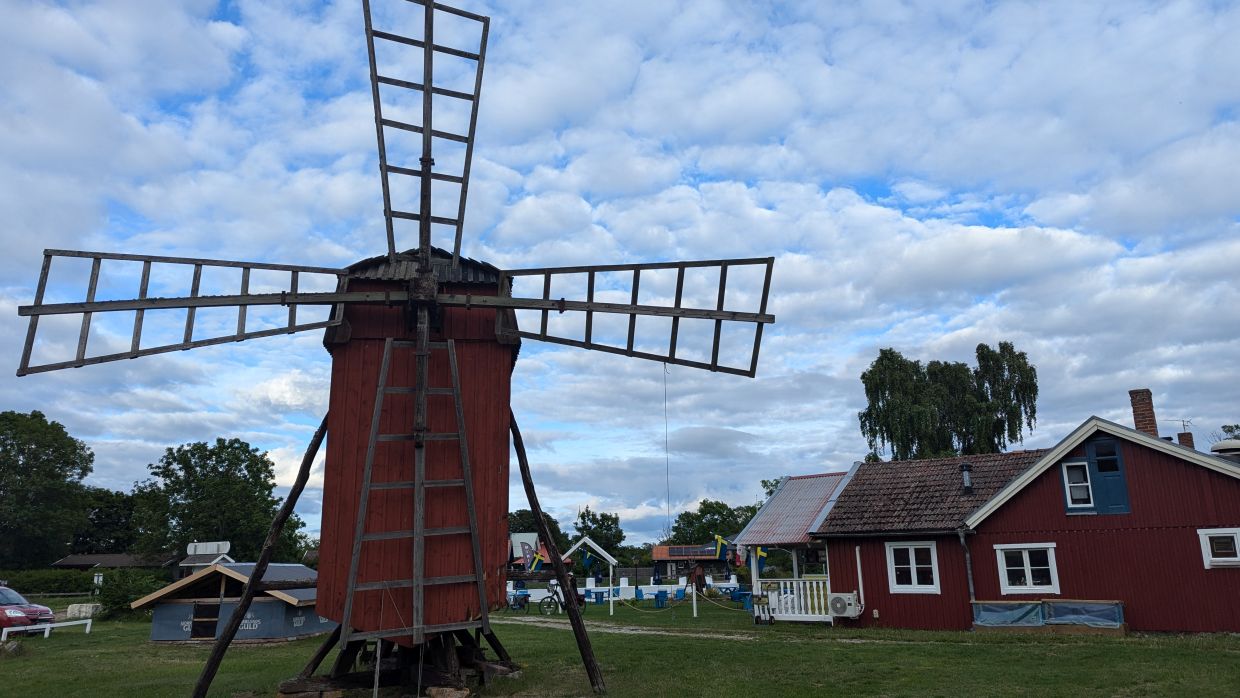 Auf der weiteren Rückfahrt machten wir in Byxelkrok in einer Wirtschaft mit Gartenwirtschaft an einer Mühle eine Rast und aßen Lufsa, ein ölandische Spezialität: ein dicker Fladen aus geriebenen Kartoffeln (eine Mischung aus Kartoffelpuffer und Kartoffelgratin) mit knusprigem Speck, Preiselbeeren und Rotkrautsalat. Es schmeckte uns sehr gut und so gestärkt fuhren wir die letzten Kilometer zurück zur Berta.