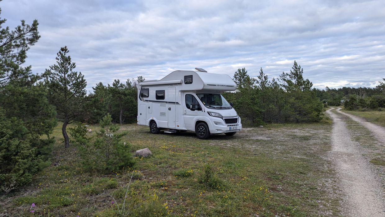 Wieder zurück an der Berta gab es ein Vesper, dann fuhren wir um 13:30 Uhr weiter gen Norden. Beim Anlassen der Berta machte sie plötzlich ein komisches Geräusch, das wir bisher nicht hatten. Udo vermutete den Auspuff, aber von außen war es nicht zu hören. So fuhren wir erst mal weiter gen Norden und bekamen nach dem Städtchen Byxelkrok einen günstigen Platz auf einem Wohnmobilstellplatz in der Natur – viel schöner als auf den großen und teuren Stellplätzen, wo ein Wohnmobil neben dem anderen steht. Leider gibt es hier ziemlich viele kleine Fliegen, aber nur die harmlosen, und die versuchten wir, so weit wie möglich aus der Berta fernzuhalten. Die Parkplätze in dieser Region sind alle mit Übernachtungsverbotsschildern versehen, so dass uns nichts anderes übrig blieb, als einen offiziellen Stellplatz zu nehmen.