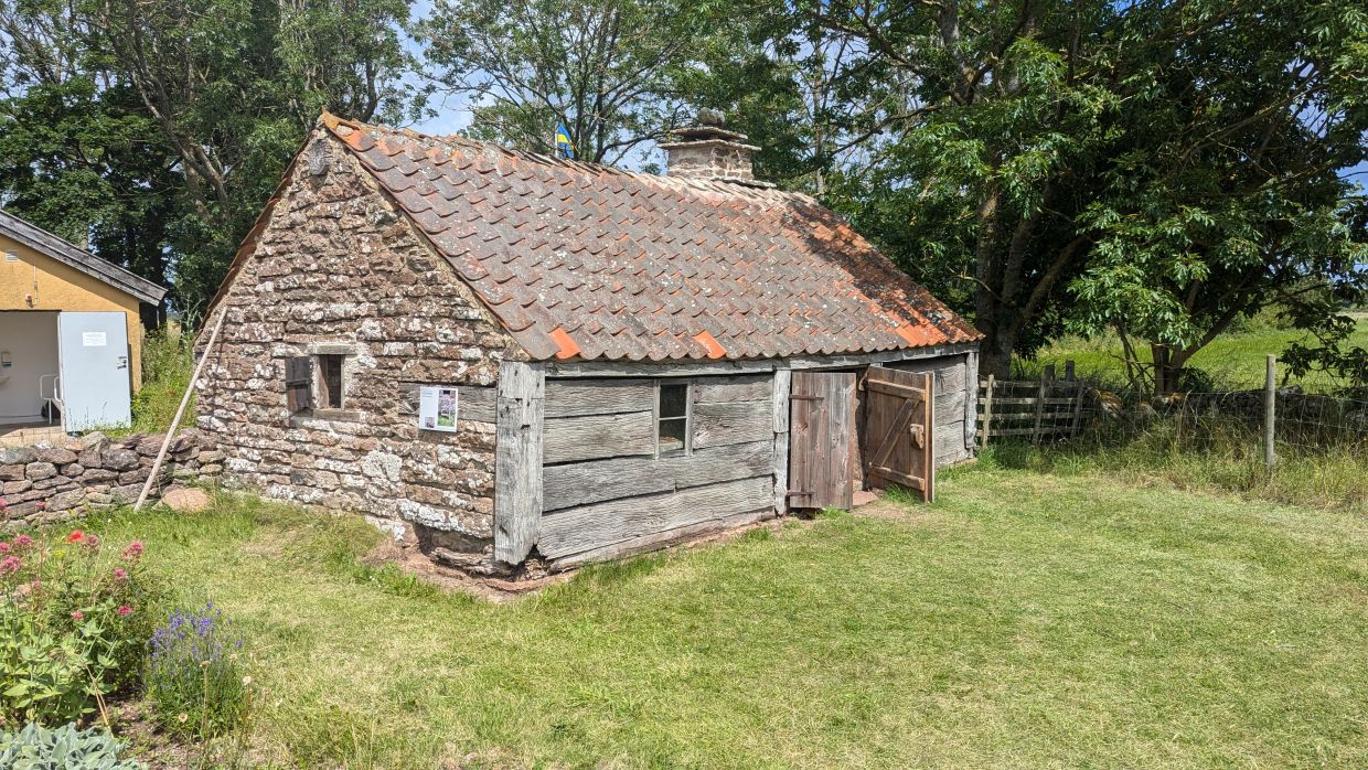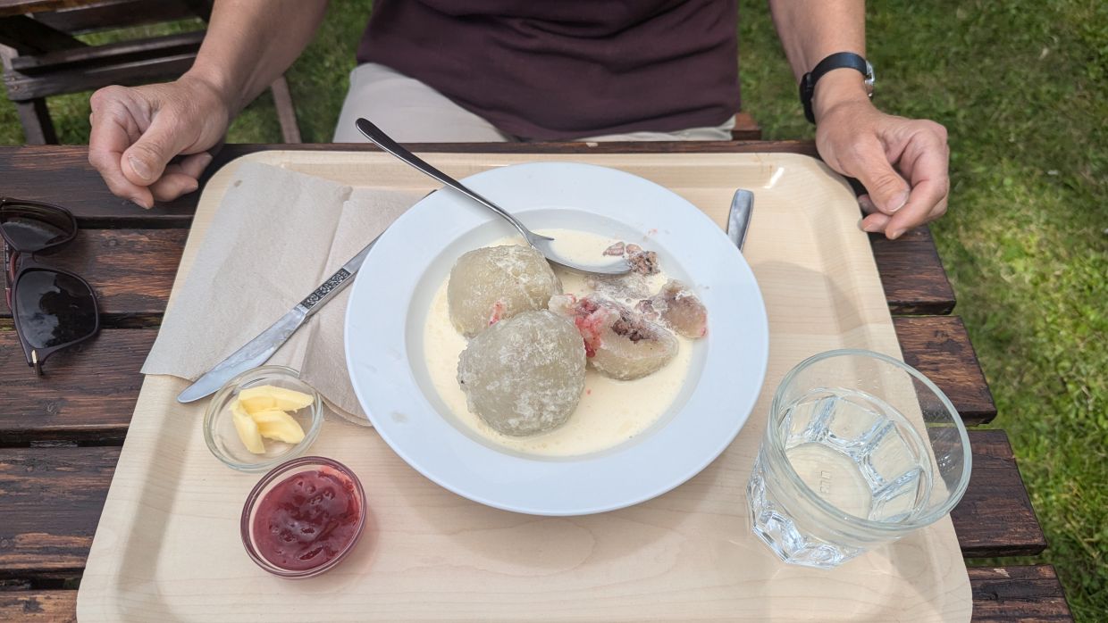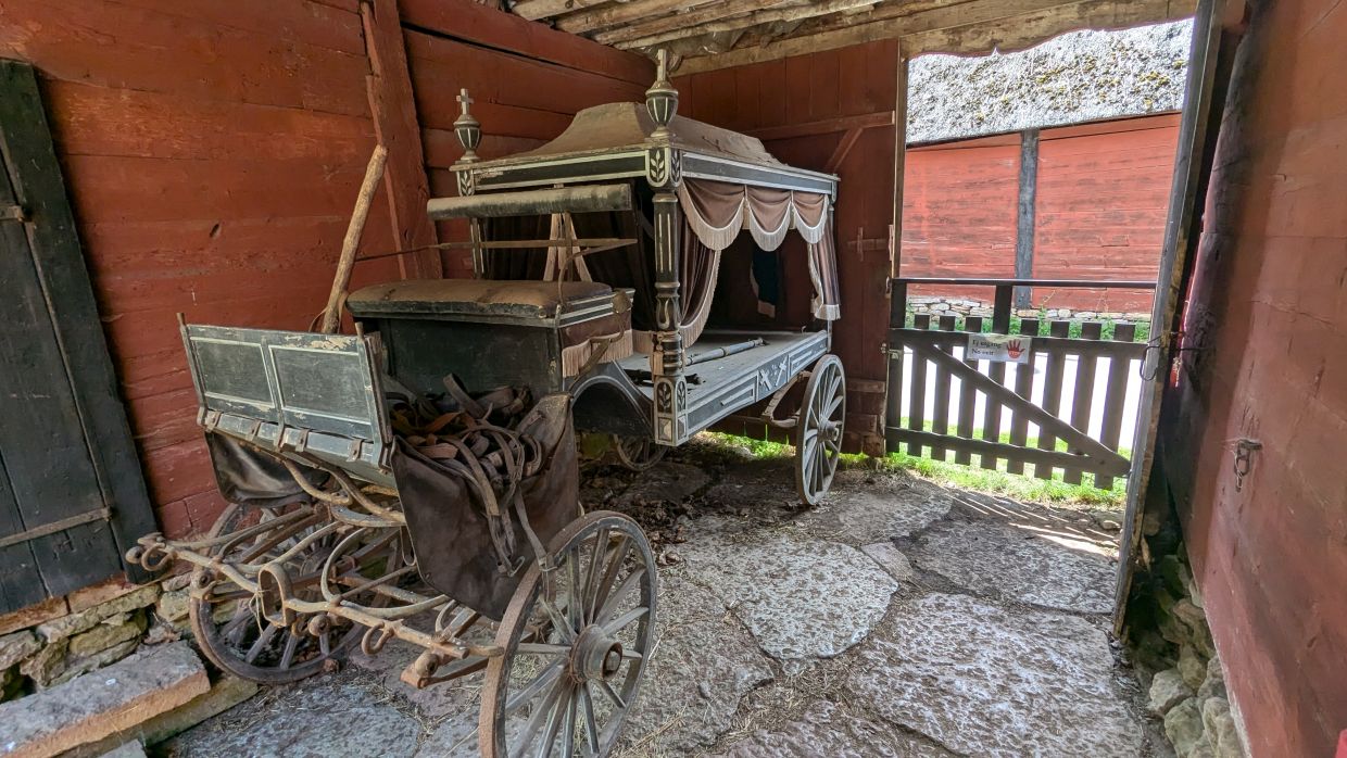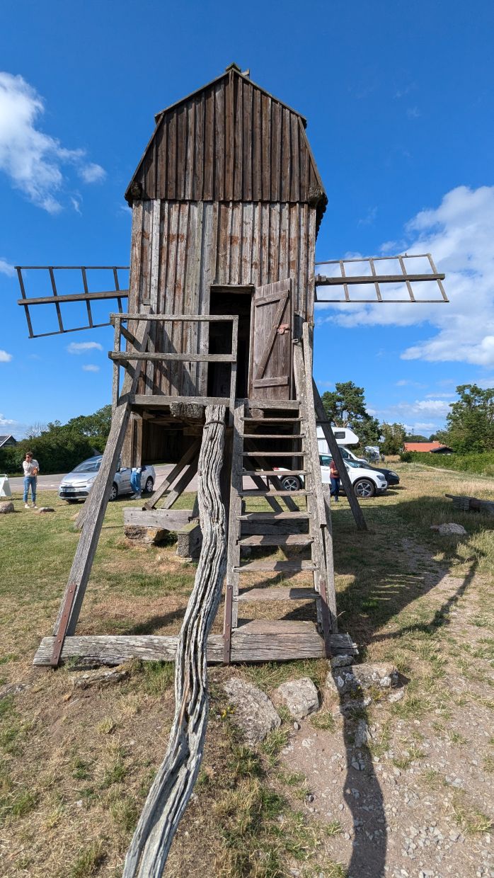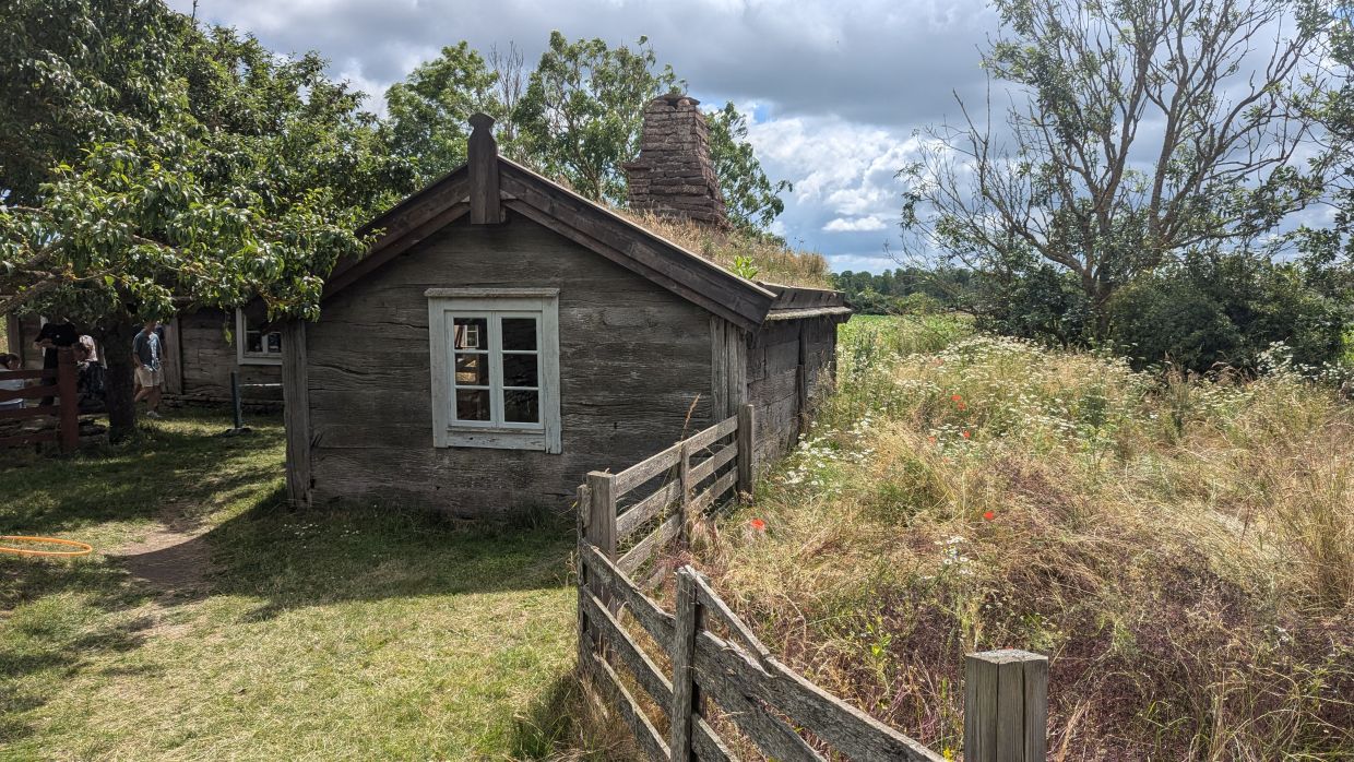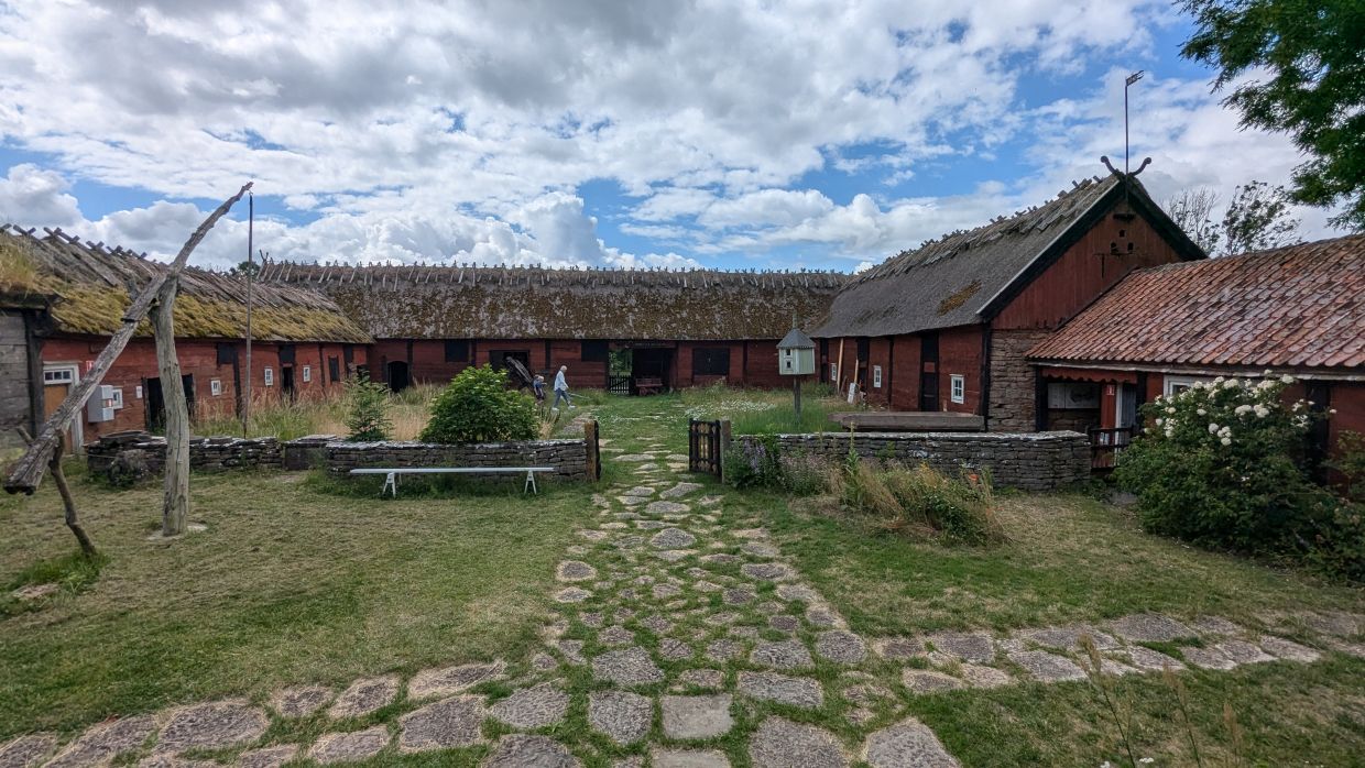 Um 12 Uhr fuhren wir weiter, jetzt wieder an die Ostküste nach Himmelsberga ins Öland-Museum. Hier bekommt man einen Einblick in das Leben in einem Reihendorf auf Öland im 18. Jahrhundert. Verschiedene Häuser in Bauernhofumgebung können hier besichtigt werden. Bevor wir das ausgiebig machten, gingen wir in eines der urigen Holzhäuschen, in dem sich das Café Kaffestugan befindet, und aßen unter einer großen Kastanie die lokale Spezialität „Kroppkakor“: mit Hackfleisch gefüllte Kartoffelklöße, die mit Preiselbeermarmelade, Butter und flüssiger Sahne serviert wurden.