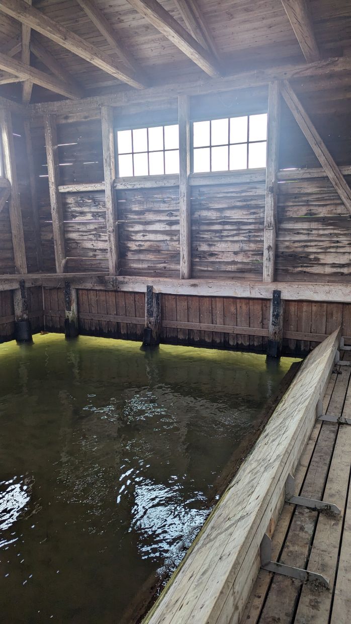 Wir verließen unseren Bade-Parkplatz um 10 Uhr bei Regen und fuhren nach Kalmar hinein. Unser erster Stopp war beim “Klapphuset”, einem historisches Waschhaus. Es wurde 1857 in Betrieb genommen und ist das einzige noch existierende öffentliche Waschhaus in ganz Skandinavien.