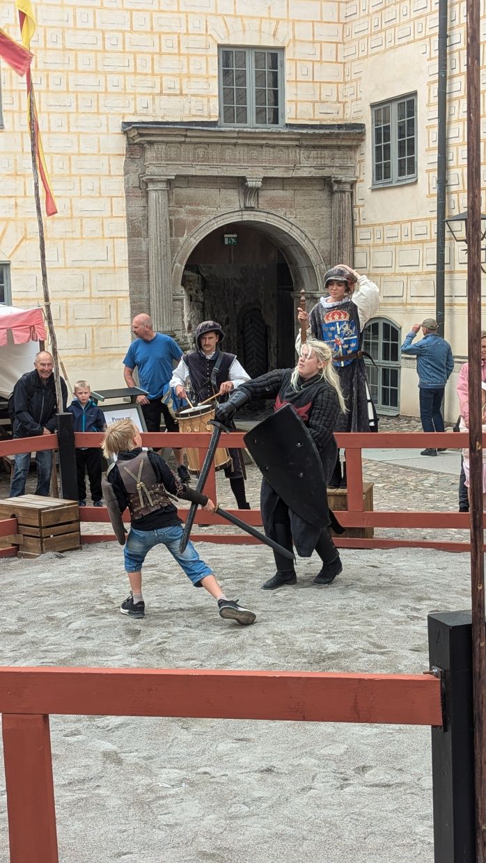 Dort kamen wir um 11:45 Uhr an. Es war eine Menge los und es wird auch einiges geboten im Schloss und im Schlosshof, vor allem auch für Kinder. Da gibt es verschiedene Spieleangebote und die Möglichkeit, gegen den Schwarzen Ritter in einem Duell anzutreten.