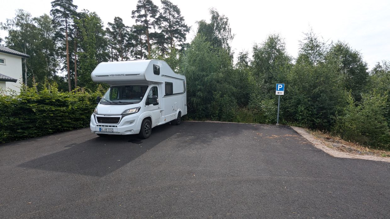 Um 16:45 Uhr waren wir wieder zurück an der Berta. Während das Wasser zum Duschen warm gemacht wurde, tranken wir einen Kaffee und aßen ein Joghurt. Dann tat die Dusche gut und wieder frisch und wohlduftend fuhren wir noch eine gute halbe Stunde gen Süden bis an den Ortsrand von Skillinge, wo die Stadt einen kostenlosen Wohnmobilstellplatz anbietet.