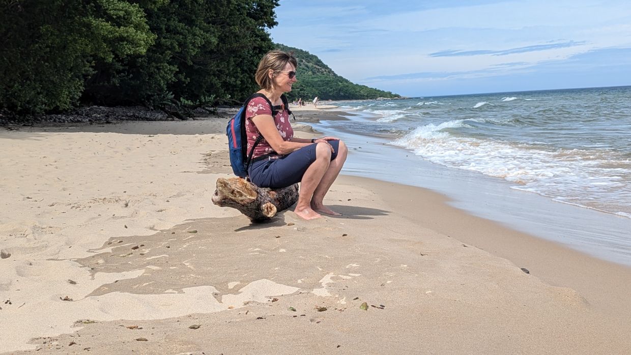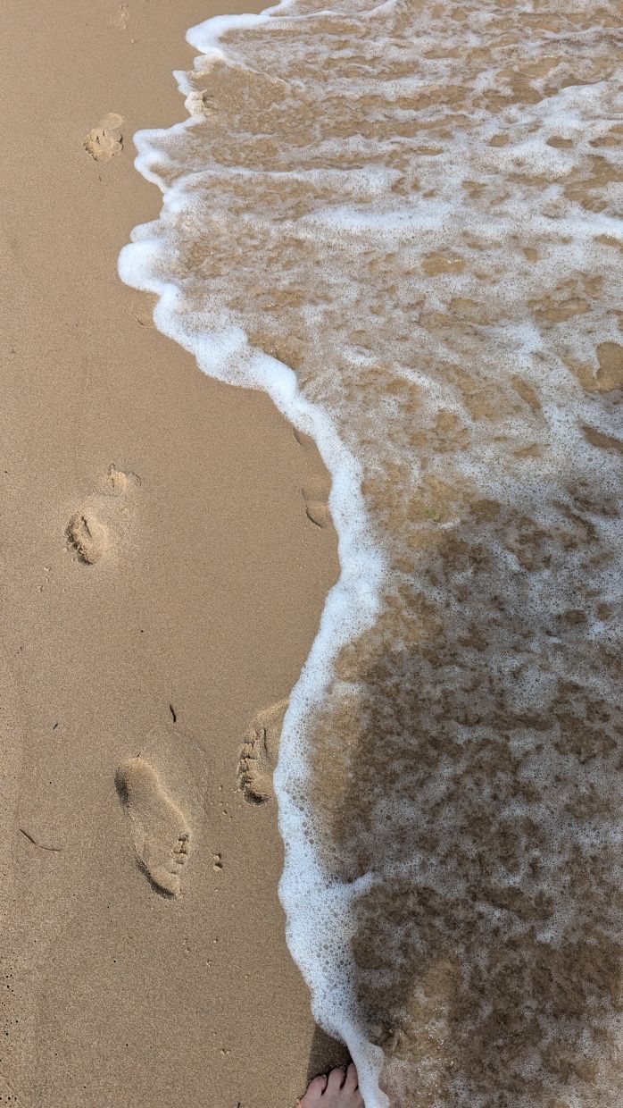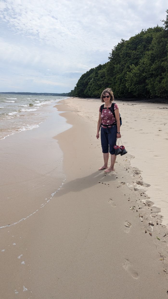 Danach kehrten wir nicht mehr zum Wanderpfad zurück, sondern zogen unsere Schuhe aus und gingen ein gutes Stück barfuß am Meer entlang. Der Strand ist schon besonders, da er direkt an einem Eibenwald gelegen ist. Das hatte schon Südseecharakter.
