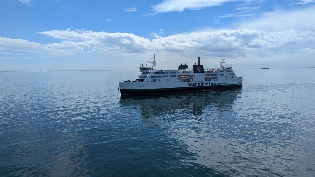 Um 9:45 Uhr kamen wir los und fuhren im Regen an Kopenhagen vorbei. Um 11:30 Uhr waren wir an der Fährstation nach Fehmarn. Unser Ticket war zwar auf 13:45 Uhr gebucht, galt aber den ganzen Tag und so stellten wir uns in die Schlange. Die übernächste Fähre nahm uns dann auch um 12:30 Uhr mit. Die Wartezeit überbrückten wir mit einem Vesper in der Berta. Wir hatten es fast beendet, als unsere Schlange in die Fähre einfahren durfte. So packte Xenia auf die Schnelle zusammen und Udo fuhr los.