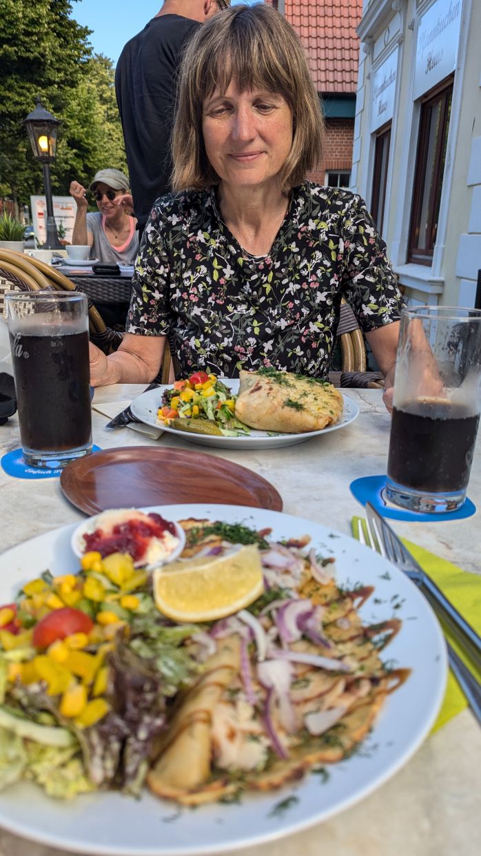 Das nächste Ziel war Burg auf Fehmarn und dort ein Pfannenkuchenrestaurant, das Xenia im Vorfeld ausgesucht und auf der Route mit eingeplant hatte. Es war eine gute Wahl! Um 18 Uhr waren wir dort, bekamen noch einen Tisch auf der Terrasse und genossen prima Pfannenkuchen: Xenias war gefüllt mit Bratkartoffeln, Speck und Zwiebeln, mit Käse überbacken und dazu gab es eine Salatbeilage und Remouladensoße. Udo wählte einen Pfannenkuchen mit Forelle, Preiselbeermeerrettich und auch etwas Salat.