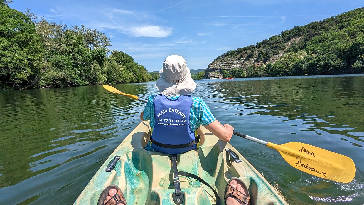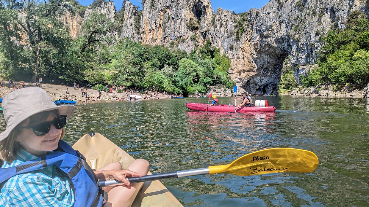 Der Fahrer wartete schon auf uns und brachte uns an den Fluss. Nach einer kurzen Einweisung konnte es losgehen. Die Fahrt war teilweise schon abenteuerlich: durch kleine Stromschnellen, über Bootsrutschen ein Stück steil hinunter (da wurde man ziemlich nass dabei) und immer wieder musste man aufpassen, nicht an Steinen hängenzubleiben. Die Ardèche ist teilweise sehr niedrig und zweimal musste Udo aussteigen und uns über die Steine schieben. Aber wir waren nicht die einzigen, denen es so ging. Auf dem Fluss herrschte ein reges Treiben.