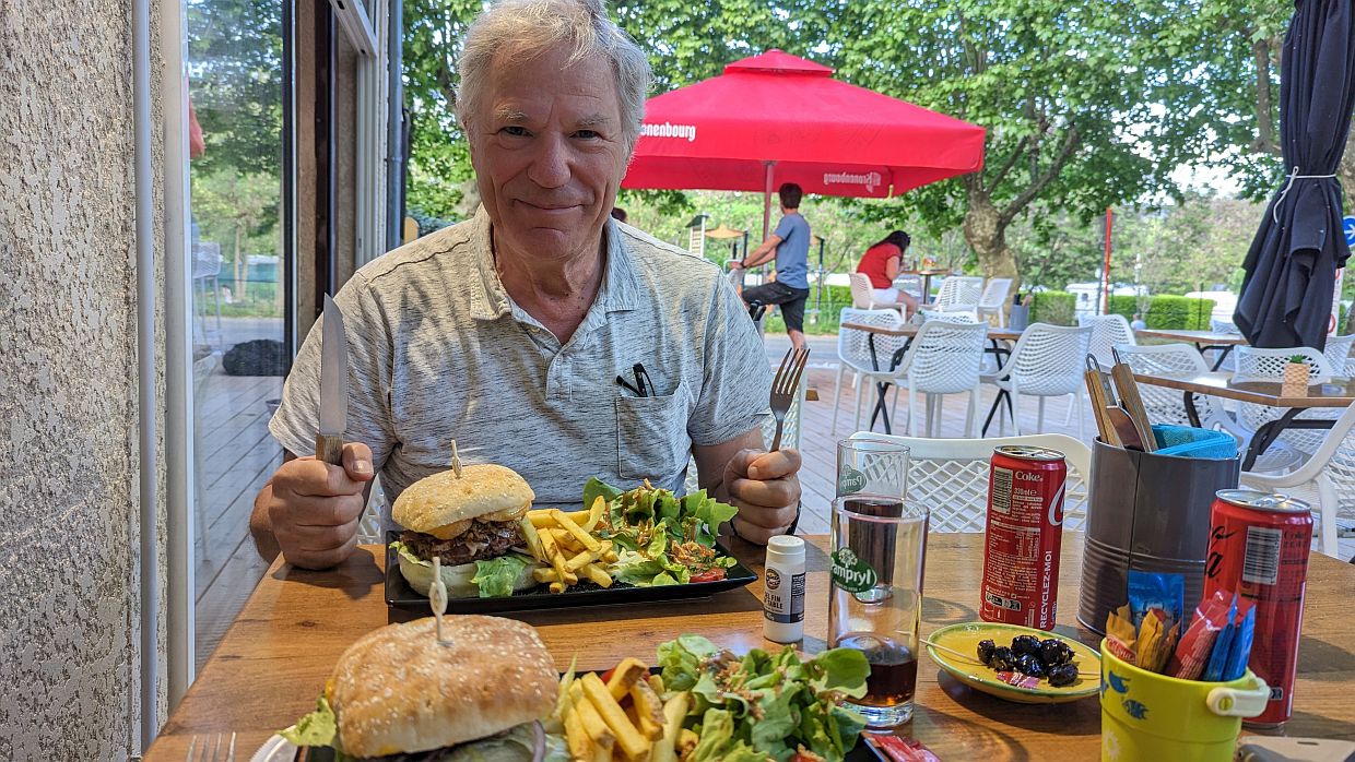 Wir entschieden uns, nicht mehr mit den Rädern in den Ort zu fahren, sondern am Platz in einem kleinen Restaurant einen Burger zu essen. Der Fahrtwind wäre sicher nicht gut für Xenias immer noch etwas geschwollene Augen gewesen. So saßen wir draußen auf der Terrasse und erfreuten uns am Sommerabend und unserem Abendessen.