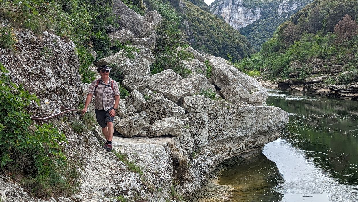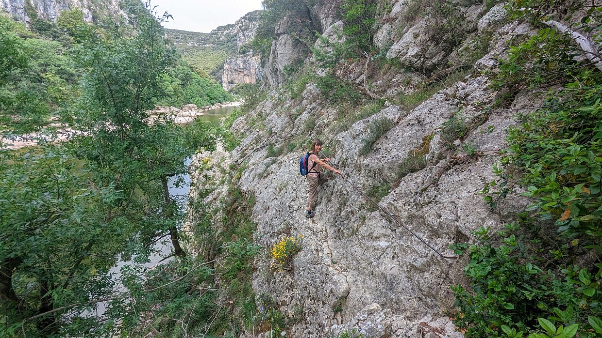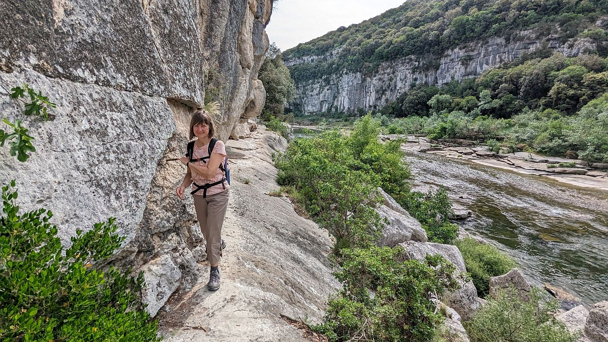 Unten angekommen, führte der Weg auf zum Teil abenteuerlichem, aber wunderschönen Pfad flussaufwärts. Wir kamen an kleinen Stromschnellen vorbei, die Ardèche schlängelt sich hier wunderschön durch die Schlucht, aber es begegnete uns auf der ganzen Strecke nur ein einziges Kanu. Der Weg wurde teilweise ziemlich abenteuerlich. Einmal mussten wir sogar durch einen Felsen kriechen.
