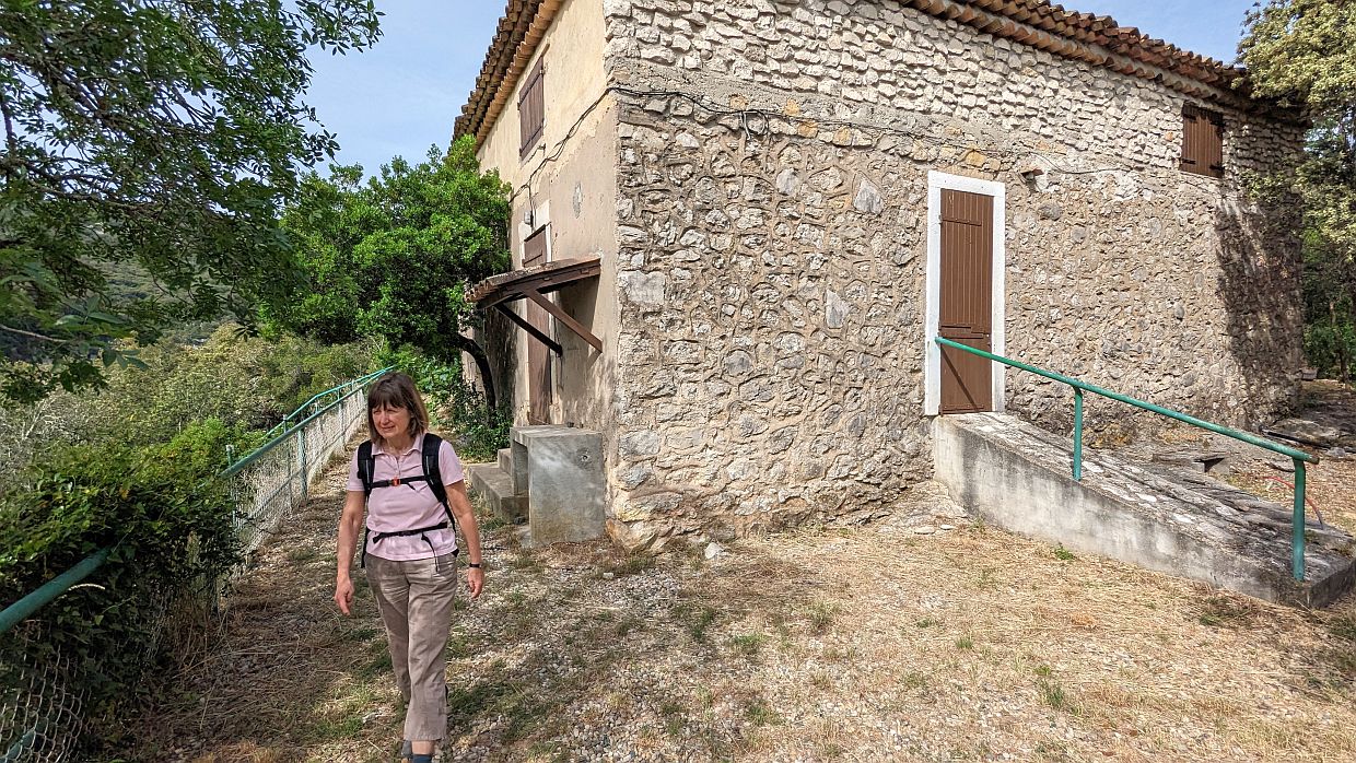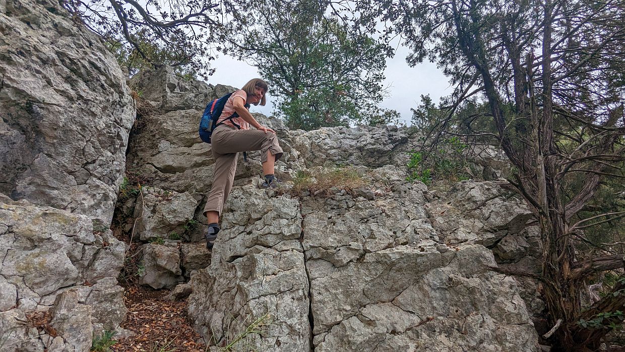 Nachdem wir die Ardèche wieder verlassen mussten, ging es sehr steil den Berg hinauf. Es war fast wie Treppensteigen, nur mit unregelmäßigen und schwierigen Tritten. Wir kamen ziemlich ins Schnaufen und Schwitzen. Endlich oben angekommen, mussten wir uns unseren Weg durch Dickicht und Steinlandschaften suchen. Wir waren immer froh, wenn wir irgendwo wieder eine Wegmarkierung entdeckten. Ohne GPS und den Track auf dem Handy wären wir wohl ziemlich verloren gewesen. So kämpften wir uns vorwärts, mal bergauf, dann wieder ein Stück bergab, bis wir schließlich wieder auf einen „normalen“ Wanderweg stießen, auf dem wir dann auch zurück zur Berta kamen.