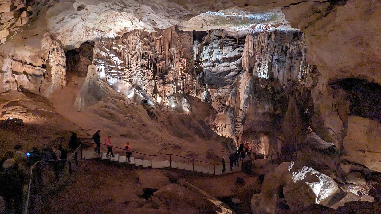 Leider war die Führung in dieser Höhle nur auf Französisch und der Guide erzählte eine Menge. So gingen wir halt am Ende der Gruppe und schauten uns das an, was wir zu sehen bekamen. Die Höhle ist sehr tief und sehr groß. Insgesamt 410 Stufen ging es in die Erde hinab, davon 215 in einem Tunnel bis zum eigentlichen Höhleneingang. Das Besondere an dieser Höhle sind neben ihrer Größe mehrere Sinterbecken, die mit Wasser gefüllt sind und mit Licht farbig angestrahlt werden. Das sieht schon sehr schön aus. Auch die riesigen Felsen und Tropfsteine sind beeindruckend, allerdings nicht so schön wie die der Höhlen, die wir schon gesehen haben (ist zumindest das Urteil von Xenia).
