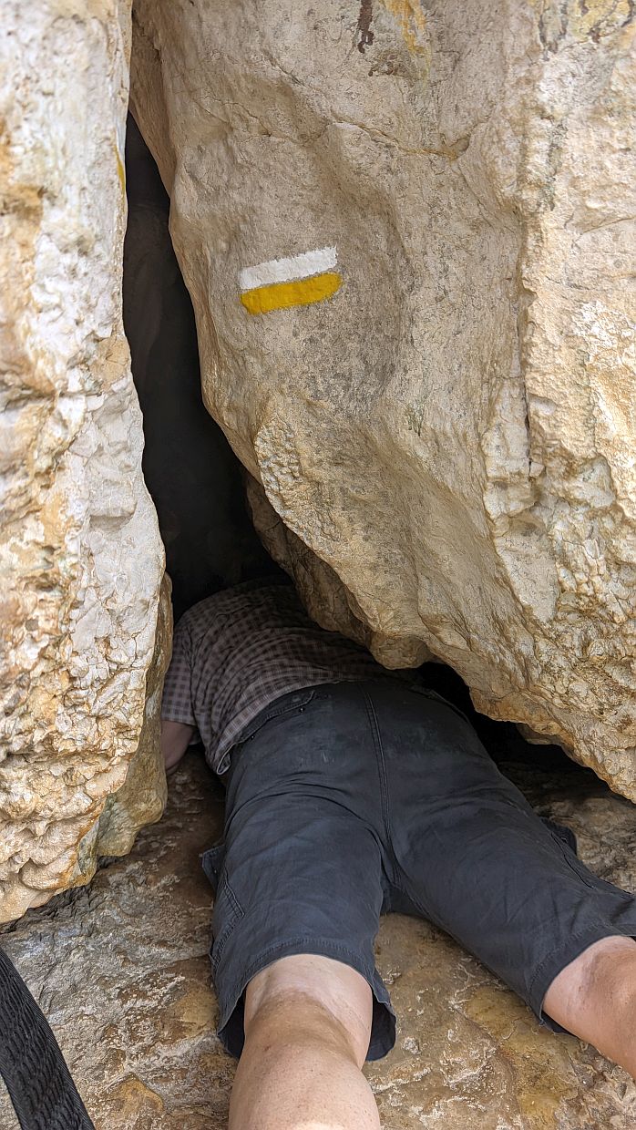 Zuerst ging es auf einem steinigen Wirtschaftsweg bergab, der sich immer mehr zu einem Wanderweg entwickelte. Wir kamen am unteren Höhleneingang vorbei, der aber abgesperrt war. Udo meinte, dass wir den Wirtschaftsweg abkürzen und auf einem kleinen Pfad den Hang hinunter gehen können. Das erwies sich aber als sehr beschwerlich und Xenia wollte zurück auf den Hauptweg. So kehrten wir um und gingen wieder den „normalen“ Weg zum Fluss hinunter.