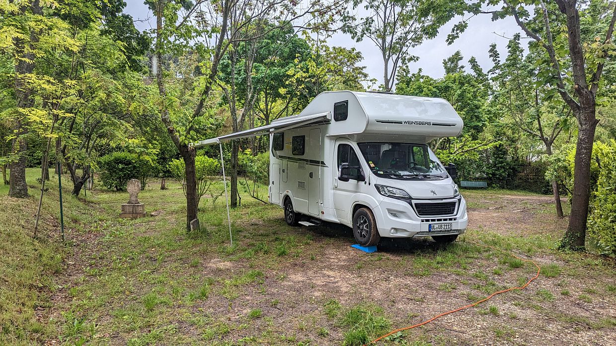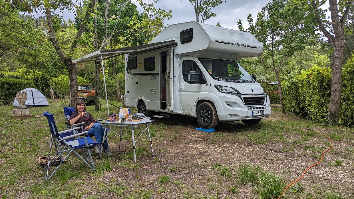 Inzwischen war es schon soweit abgetrocknet, dass Udo Tisch und Stühle rausstellte und wir draußen noch ein süßes Stückle mit einer Tasse Kaffee zu uns nahmen. Danach ging Xenia duschen und Udo beschäftigte sich mit seinem Höhlenprogramm. Als Xenia zurück war, ging auch Udo noch unter die Dusche. Plötzlich und völlig unverhofft ging ein kurzer Starkregen über den Platz und das Handtuch, das Xenia zum Trocknen auf den Wäscheständer gehängt hatte, war nasser als zuvor nach dem Duschen. Als der Regen etwas nachließ, kam Udo zurück und da es durch den Regen deutlich kühler geworden war, zogen wir uns in die Berta zurück und verbrachten dort den Abend.