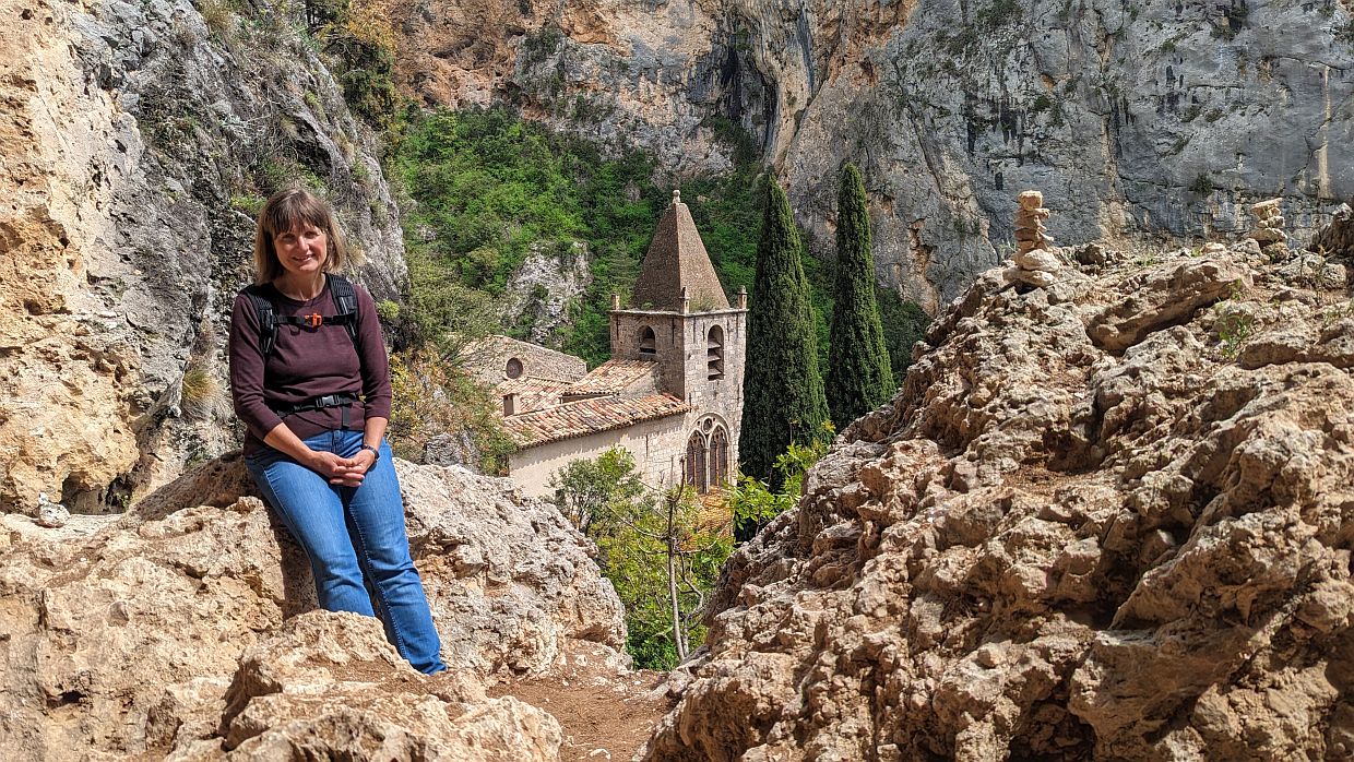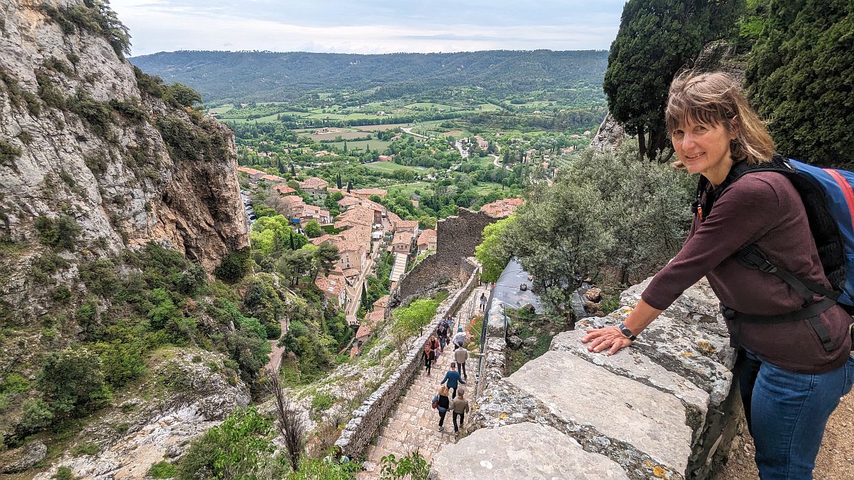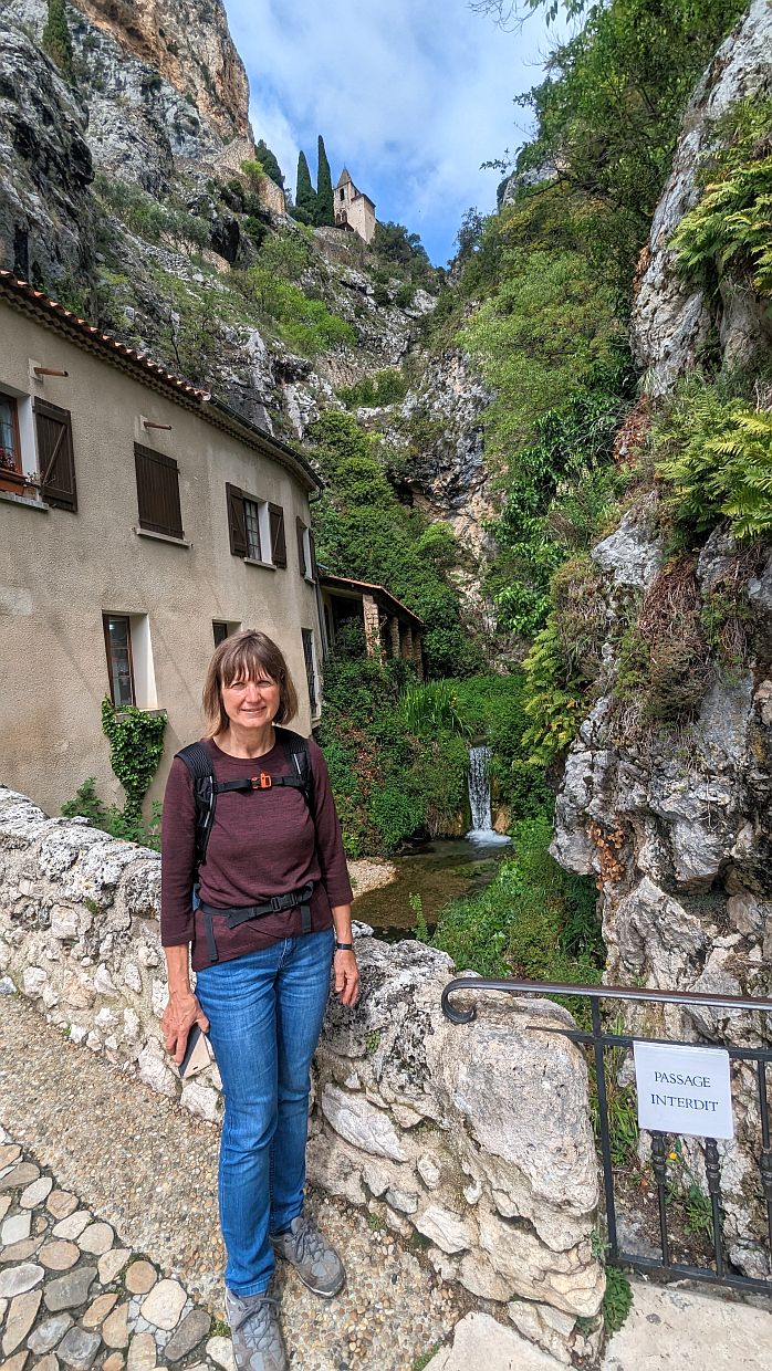 Aber die Hauptattraktion ist die oberhalb des Dorfes auf einem Felsplateau gebaute Kapelle „Notre-Dame de Beauvoir“ aus dem 16. Jahrhundert. Eine Felsentreppe mit 262 Stufen führt zu dieser Kapelle hinauf. Die Kapelle an sich ist nicht so besonders, aber ihre Lage, der Weg nach oben und der Blick von dort sind schon ganz besonders. Oben angekommen kam sogar die Sonne heraus und wir erkundeten noch zwei kleine kurze Wege, die von dort abgehen, aber in Sackgassen enden.